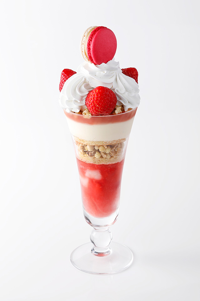 フレッシュな「博多あまおう®」とライチの果肉がごろっと入ったあまおうジュレ、ホワイトチョコレートでコーティングしたグラノラ、濃厚なバニラアイスクリーム、果汁たっぷりのあまおうシャーベットを重ね、仕上げにクリーミなアーモンドミルククリームと大粒の「博多あまおう®」、あまおうマカロンをトッピングした、いちご好きのためのご褒美パフェ。