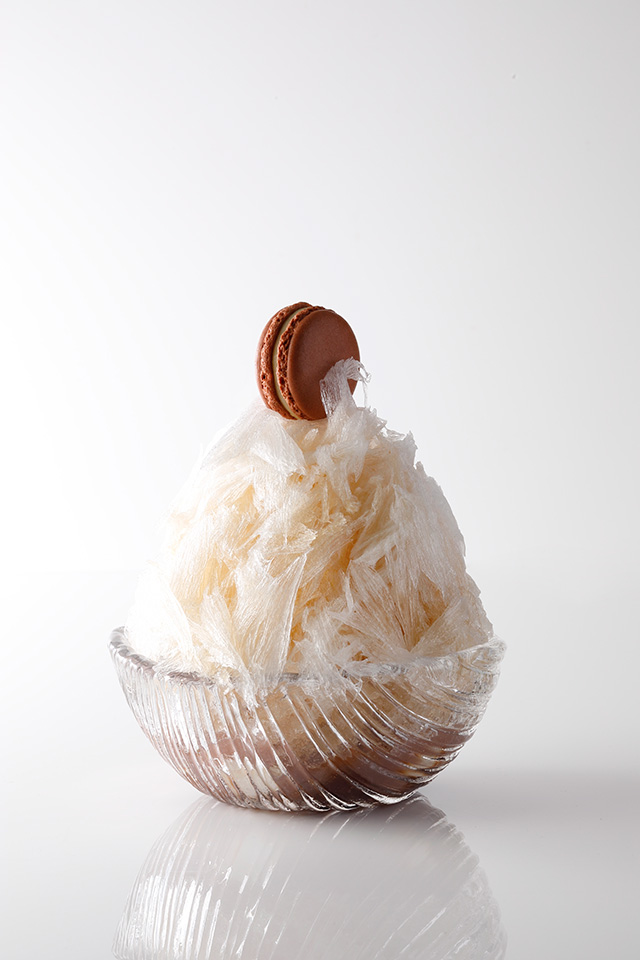 天然氷の中に白玉・羊羹ゼリー・黒蜜あんこを忍ばせ、和三盆ソースをあしらいました。隠し味に"藻塩"を使うことで、和三盆糖のやわらかい甘みが引き立ちます。和三盆と黒蜜、藻塩が絶妙なバランスで調和した、シンプルなれど奥深い味わいのかき氷です。