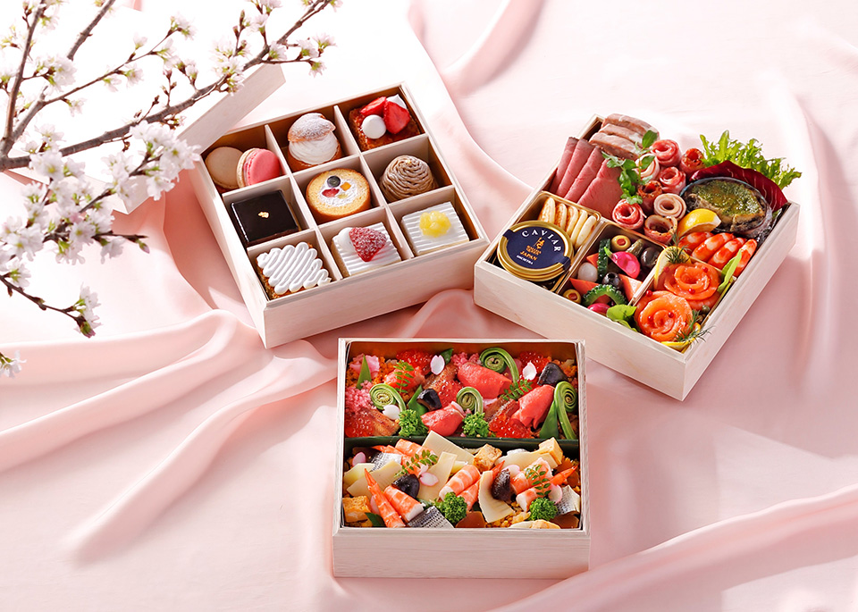 海老、小肌、穴子など贅沢三昧の魚介に加え、春の訪れ感じる旬の食材を贅沢に使用した2種のちらし寿司に、ローストビーフや大ぶりの鮑のジェノベーゼなどが愉しめるフレンチオードブルスタイルのお重、そして「パティスリーSATSUKI」の”スーパーシリーズ”をはじめとする人気スイーツを詰め込んだスイーツ重と、贅を極めたこの季節限定のお花見重。お花見の席をちょっと豪華に彩ってくれるホテルならではの美食が詰まった逸品です。