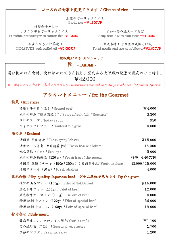 Savor the sight and aroma of the choicest Japanese beef, including Kuroge Wagyu considered to be one of the finest amoung the various " Wagyu " brands and the freshest seafood and vegetables as they are prepared to order before you. Teppanyaki KEYAKI located on top of the hotel provides diners with the added entertainment of watching the skilled chefs prepare your meal with precise and agile movements as well as a full view of the historical Osaka Castle.