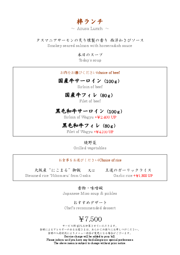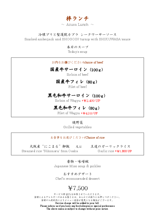 | Hours | Lunch : 11:30a.m. - 2:30p.m. Dinner : 5:00p.m. - 9:30p.m. (L.O. 8:30p.m.) Reservation by 3:00 p.m. the day before |