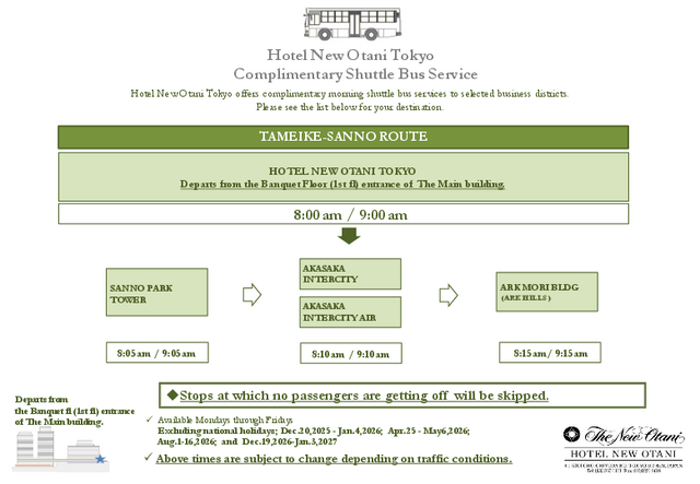 Hotel New Otani Tokyo offers complimentary morning shuttle bus service to selected business districts.