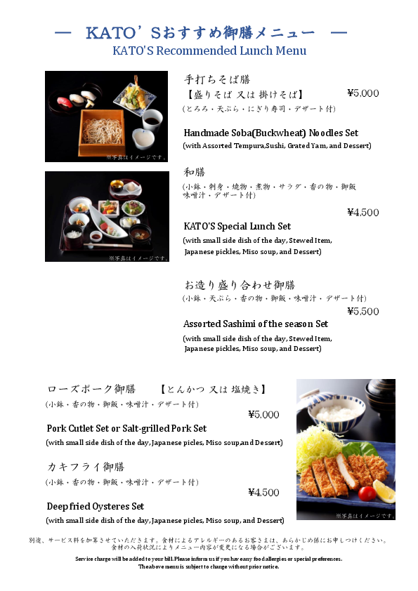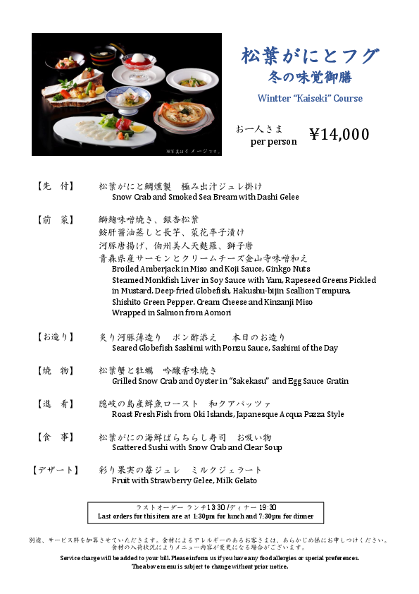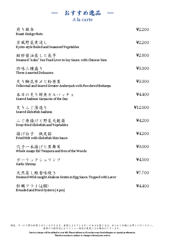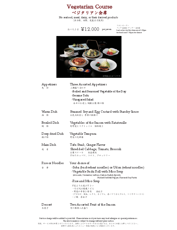 | Hours | Lunch: 11:30am - 3:00pm (last orders 2:00pm, 1:30pm for kaiseki courses) Dinner & Bar: 5:00pm - 10:00pm (last orders 9:00pm, 7:30pm for kaiseki courses, 9:30pm for beverages) *Also open 2:00pm - 5:00pm on weekends & holidays, offering tea menu only | |