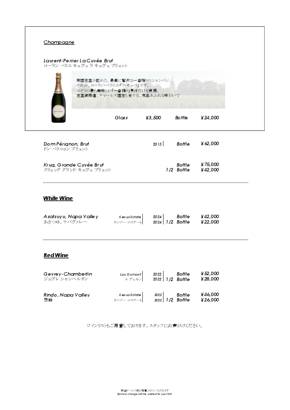 | Wine | (glass) ¥3,000 and up |
