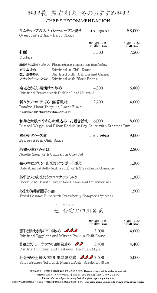 | Hours | Lunch: 11:30am - 3:00pm (last orders 2:30pm) Dinner: 5:00pm - 10:00pm (last orders: courses 9:00pm, a la carte 9:30pm) *Open 11:30am - 10:00pm on weekends and holidays (last orders: courses 9:00pm, a la carte 9:30pm) |