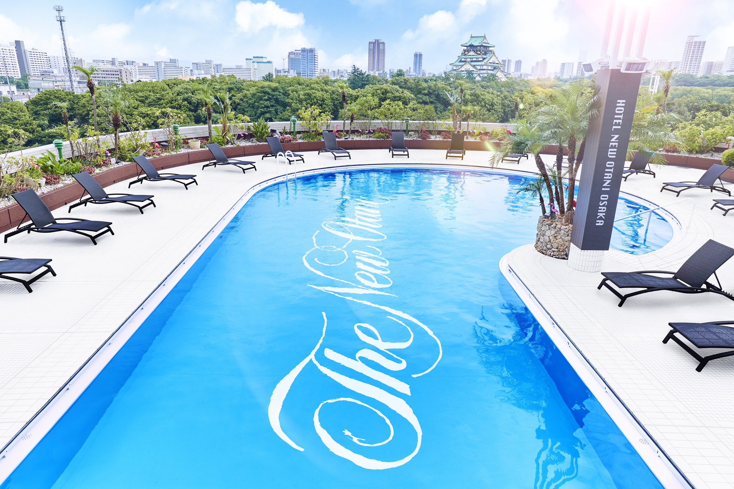 高層ビル群を背景に、ホテル内外の豊かな緑と澄み渡る広大な青空に囲まれた、