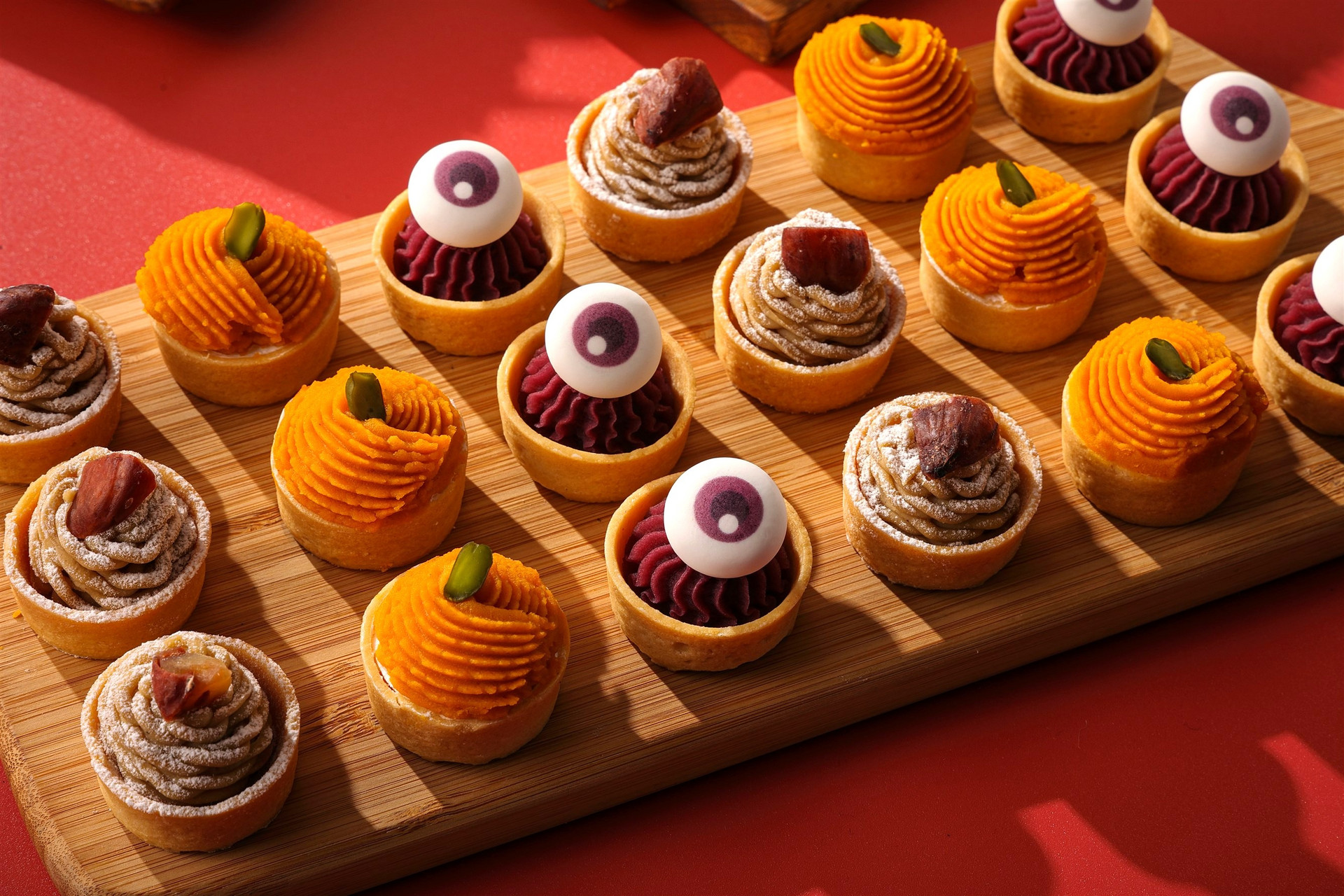 ハロウィンシーズンは旬の味覚が豊富に揃う季節でもあります。栗やかぼちゃ、ぶどうなどを使用したスイーツが勢ぞろい!定番のモンブランは、プティタルトに栗、パンプキン、紫芋の3種のペーストをたっぷりとのせて秋色タルトに。食べ比べしながらお好みの味を見つけていただけるように一口のビュッフェサイズでご用意しました。毎年不動の人気の「マロンミルフィーユ」や、スポンジに炭のパウダーを練り込んだ「ブラックマロンショートケーキ」になめらかな「かぼちゃのプリン」も。