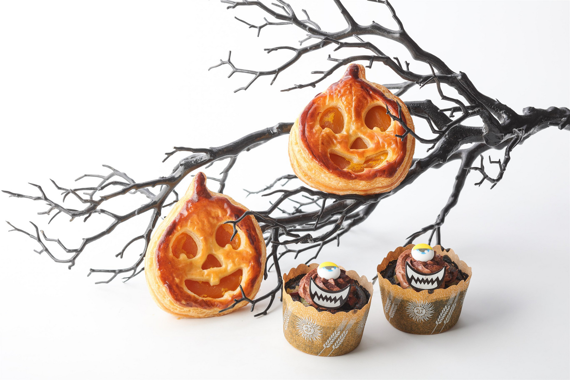 ジャックオランタンのかぼちゃパイ(左)、金蜜芋のブラックチーズケーキ(右)
