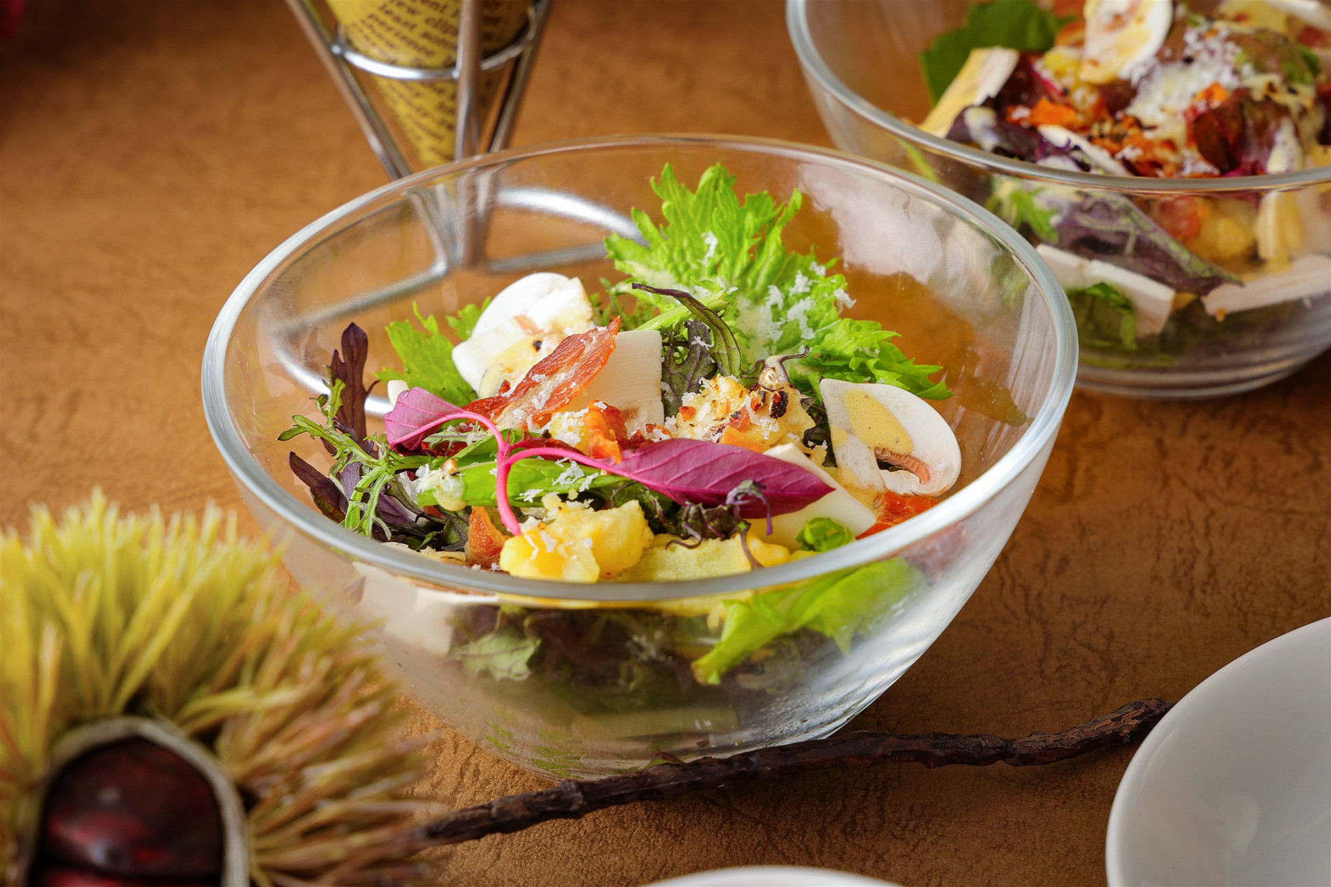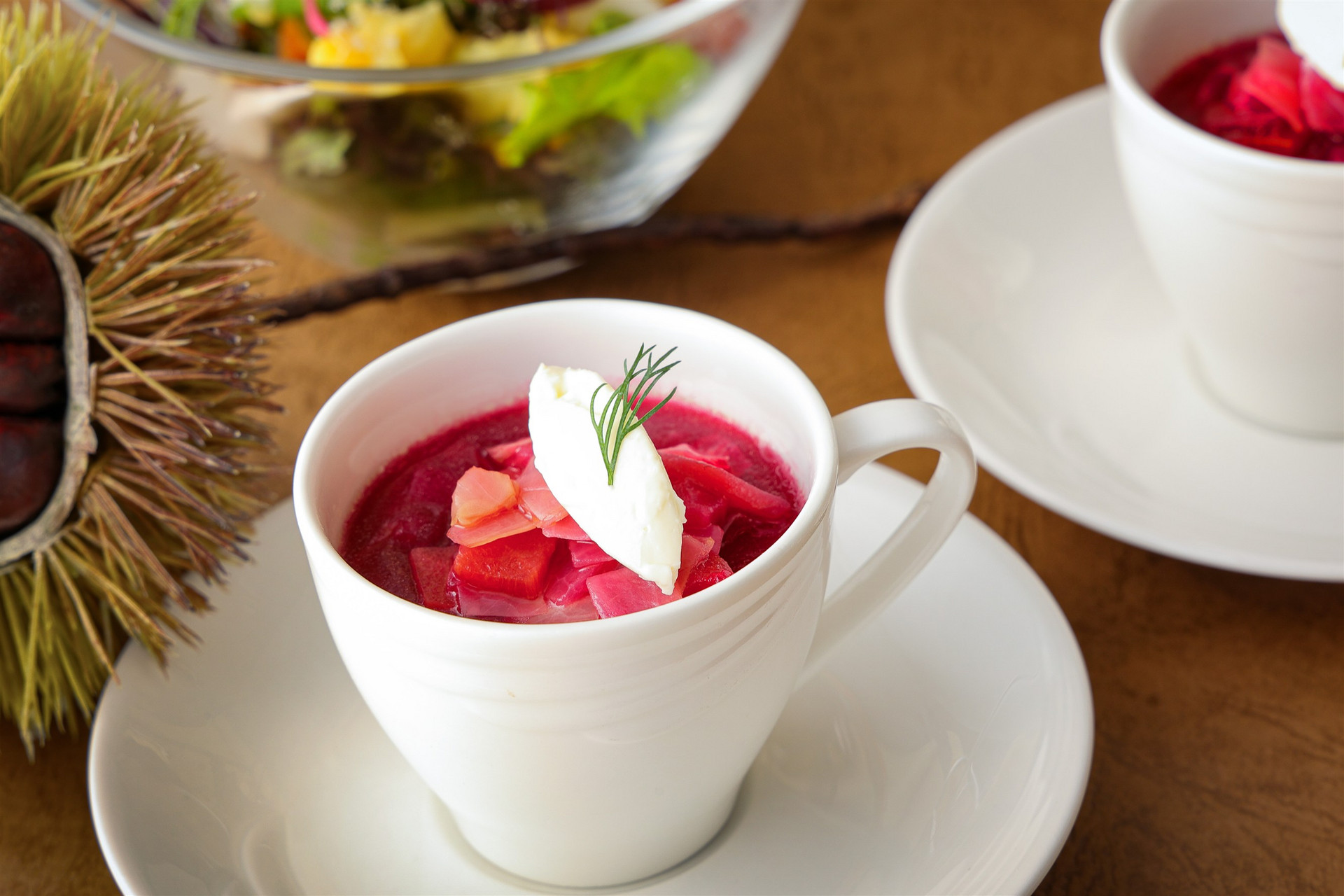 前菜にぴったりの「トリュフ香るじゃがいもとマッシュルームのカルボナーラ風サラダ」や、酸味と甘みが調和した「たっぷり野菜のボルシチスープ」のほっこりするメニューもお見逃しなく。