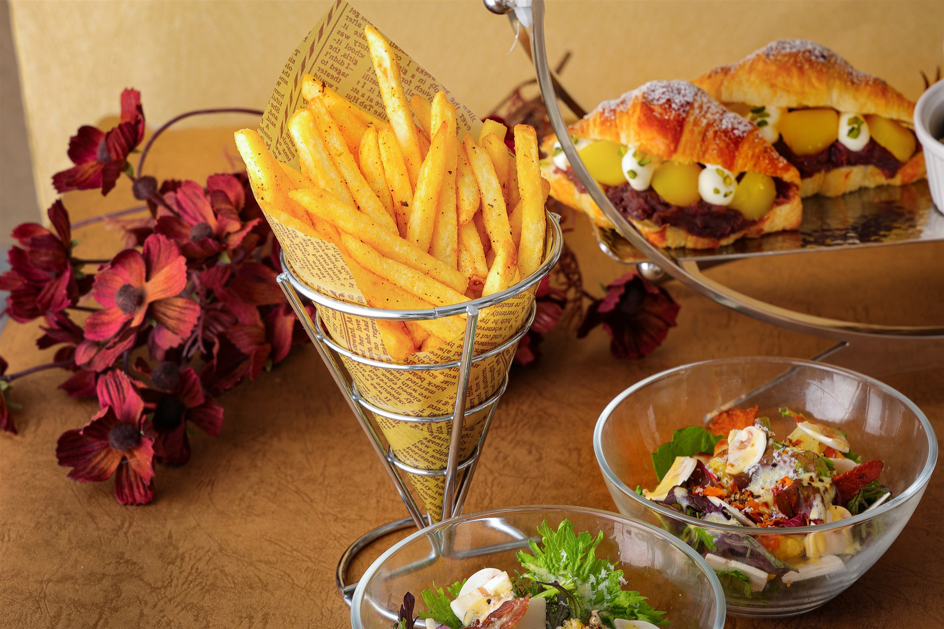 そのほかには、香ばしいスパイスが後を引く「スパイシーフライドポテト」、洋梨などの旬の果実を贅沢に仕立てた「季節のフルーツコンポートパフェ」「ショコラプレート」もご用意。最後のひとくちまで、華やかな味わいが続きます。