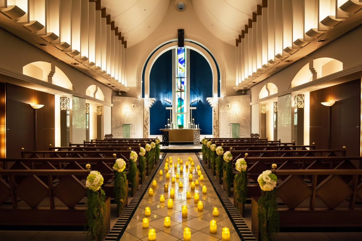 本プラン限定のキャンドル装飾オプションでは、LEDキャンドルの灯りがチャペル全体を包み込み、幻想的な輝きがふたりをやさしく照らします。揺らめく灯りに映し出される純白のバージンロードは、まるで映画のワンシーンのよう。聖夜だけの特別な空間で、心に残る奇跡の瞬間を演出します。