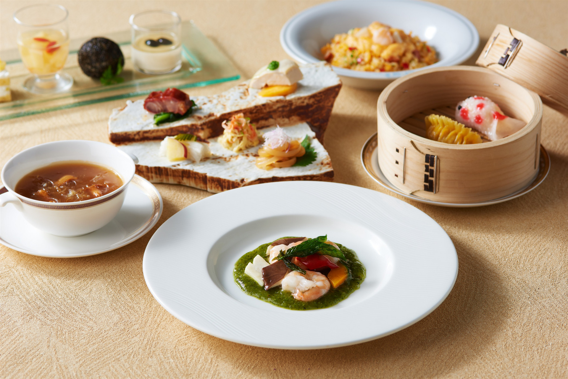 コースに追加していただけるスペシャリテとして、中華のジャンルを超えた逸品「冷製キャビアのビーフン カッペリーニ仕立て」(¥3,000)もご用意。フレンチやイタリアンに精通するホテルニューオータニ幕張 総料理長 小出 裕之も認めたまさに中華の新境地と言える逸品で、香り高い自家製葱油で仕上げたビーフンに、二種類の胡麻油で奥深い香りをプラス。その上には海の宝石と称されるオシェトラキャビアを惜しみなくのせました。見た目の美しさはまるでイタリアン。しかし、一口食べれば葱油と胡麻油の香ばしい香りとともに後味はどこまでも洗練された中華の味わいが広がります。中華の可能性を広げる一皿にご期待ください。