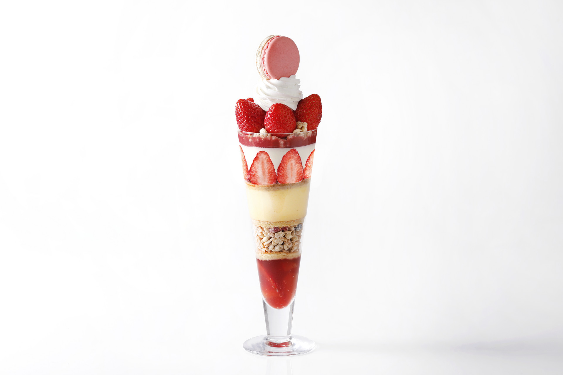 パフェグラスの底からトップまで13層からなる『あまおうパフェ』は、フレッシュないちご、ジュレやソース、マカロンなど、さまざなスタイルであまおうをご堪能いただけます。滑らかなマスカルポーネクリームや、グラノラなど「層」ごとに異なる食感もお愉しみください。