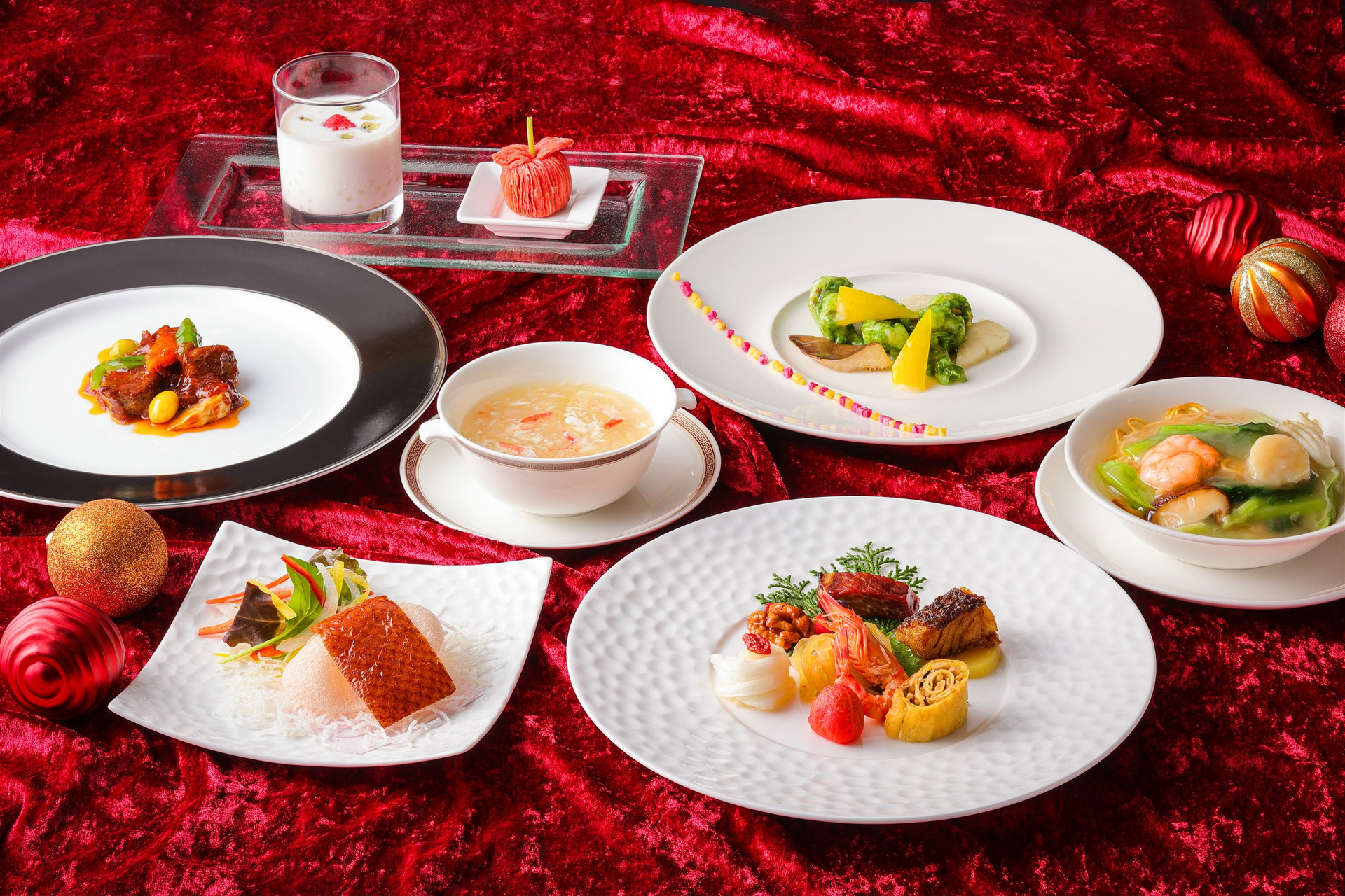 中国料理「大観苑」では、旬の味覚をしっとりと織り込んだ華やぎのコースをお届けします。中華の王道「ふかひれ」を贅沢に用いた白金に輝くスープ、北京ダックに加え、メインにはクリスマスらしい肉厚な牛フィレ肉の特製スパイス炒めなどをご用意しました。特別な夜にふさわしい逸品とともにクリスマス気分を味わい、至福のひとときをお過ごしください。