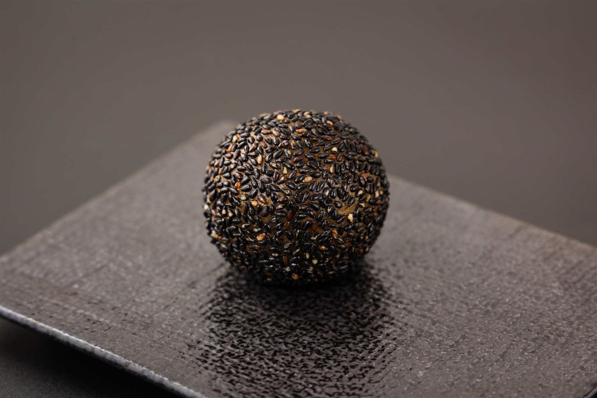 ラム酒と紹興酒が芳醇に香る自家製レーズン餡を、よもぎを練り込んだ皮で包み、漆黒の胡麻を纏わせました。黒胡麻の香ばしさと洋酒の余韻が重なる、少し大人な味わいに仕上げた逸品。