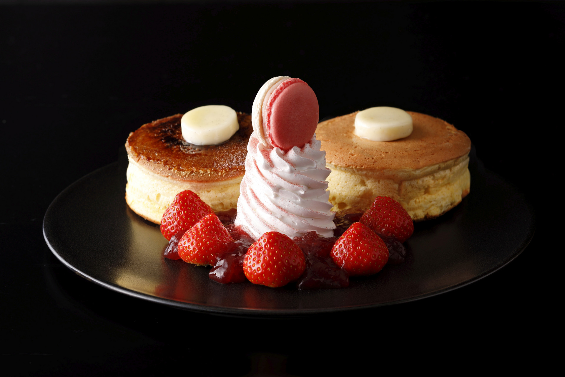 ホテルニューオータニを代表するスイーツのひとつとして、長年多くのお客さまに愛され続けてきた「パンケーキ」。リコッタチーズ、クリームチーズ、マスカルポーネの3種を絶妙なバランスでブレンドし、口に入れた瞬間にほどける極上のふわふわ食感を実現しました。さらに、ホテルオリジナルの雑穀「ホワイトシリアル」を使用することで、軽やかで上品な後味に仕上げ、2枚のうち1枚は表面を香ばしくキャラメリゼし、食感のコントラストもお愉しみいただけます。サイドには、大粒の「博多あまおう」を贅沢に5粒添え、あまおうジュレ、抹茶カスタードクリーム、黒蜜あんこ、バニラビーンズ入りの特製生クリームを重ねた華やかな一皿に。仕上げにあまおうマカロンをトッピングした、あまおう尽くしの一皿です。