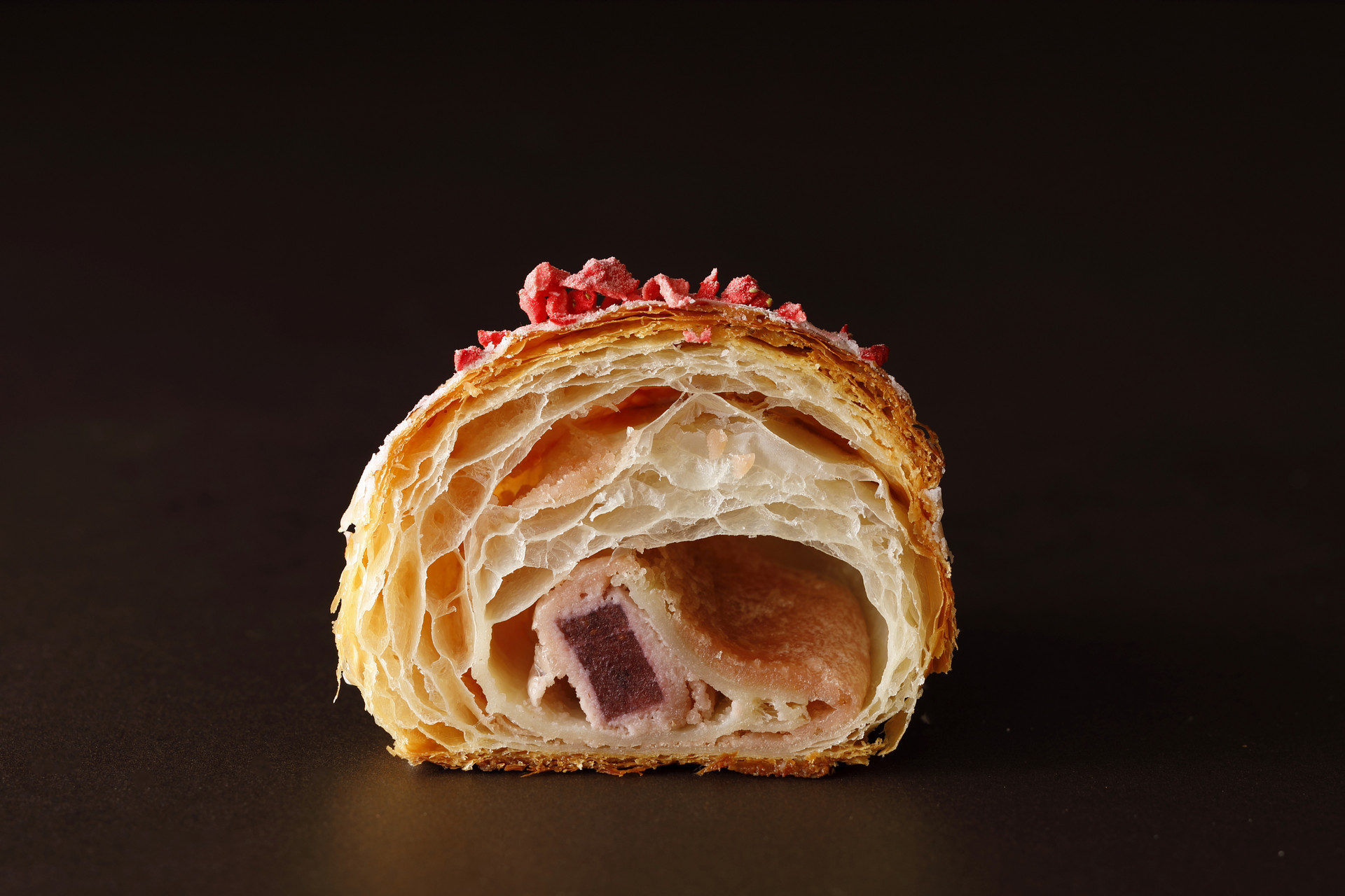 「生のあまおうを食べているかのような味わいを表現したい」と誕生した一品。高温の焼き窯に耐えうる“溶けないジュレ”は、あまおうの風味を活かし、生地はジュレとのバランスを考え特製の“甘すぎない生地”を合わせました。内側には果実の濃厚なエキスを塗り込み、仕上げにあまおうのフリーズドライをふりかけ、どこから食べてもあまおうを感じるクロワッサンに仕上げました。