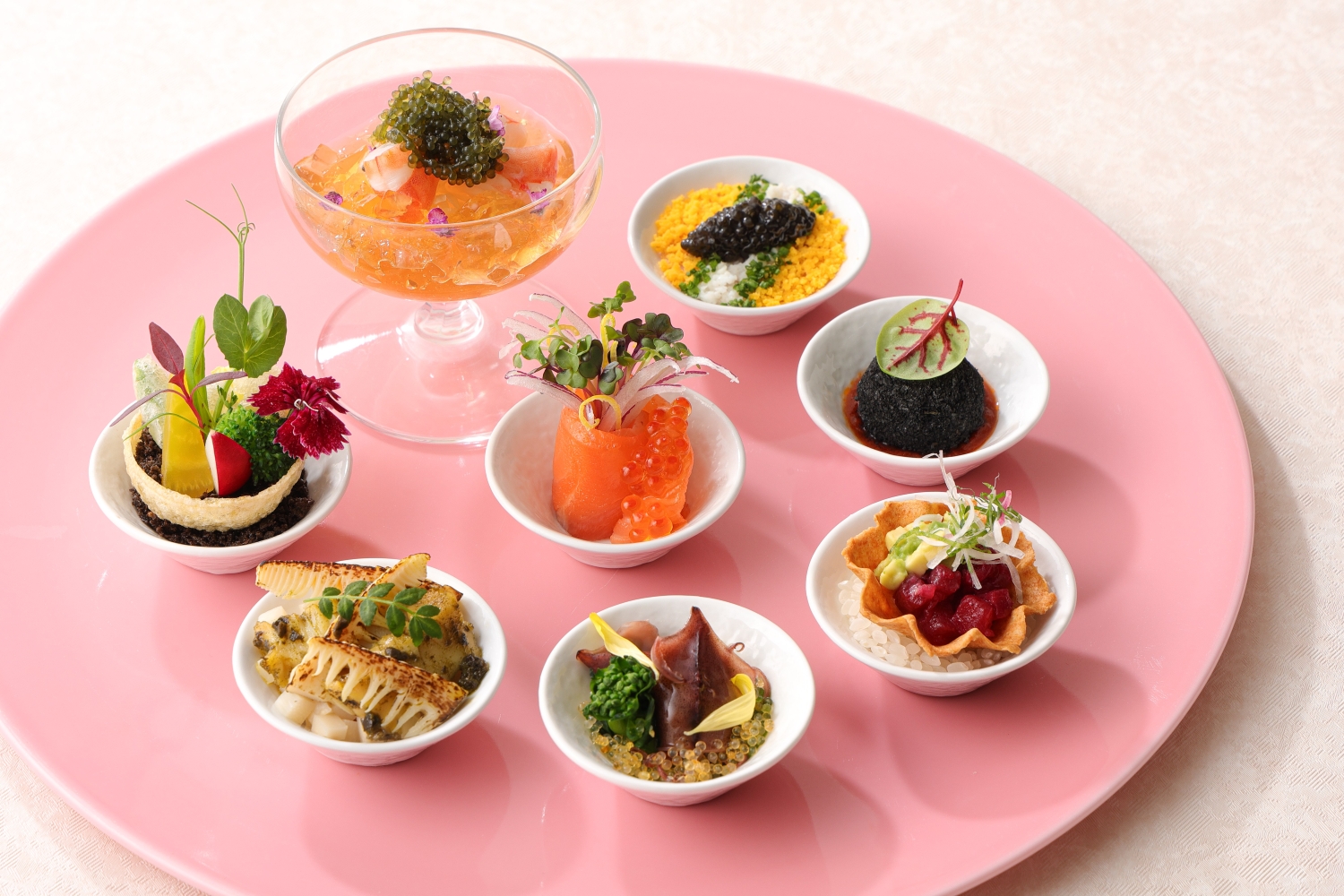 コースの幕開けは、旬の食材を少しずつ愉しめる彩り豊かな全8種の前菜をご用意。蛍烏賊と菜の花を合わせた「蛍烏賊の菜花和え」、瑞々しい野菜を特製ソースで味わう「バーニャカウダ庭園風」、グラス仕立ての「海老とグリーンキャビアの土佐酢ゼリー寄せ」、和牛入りリゾットを揚げた「和牛のアランチーニ」など、春色をまとった一品一品が並びます。