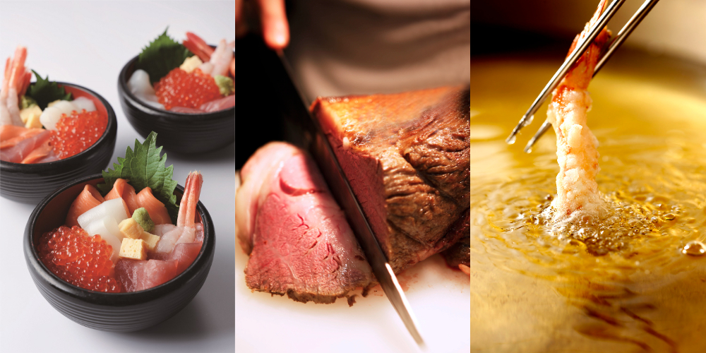 ホテルの王道メニューも豊富なラインアップでご用意しました。いくらやマグロなど、お好みの海鮮がのせ放題のオリジナル海鮮丼やホテル伝統のローストビーフ、ほんのり甘いタレが食欲をそそるすき焼き丼に揚げたての天麩羅など、ライブ感あふれるシェフのクッキングサービスで出来立てを提供するほか、ニューオータニ自慢の和・洋・中のメニューをお愉しみいただけます。
