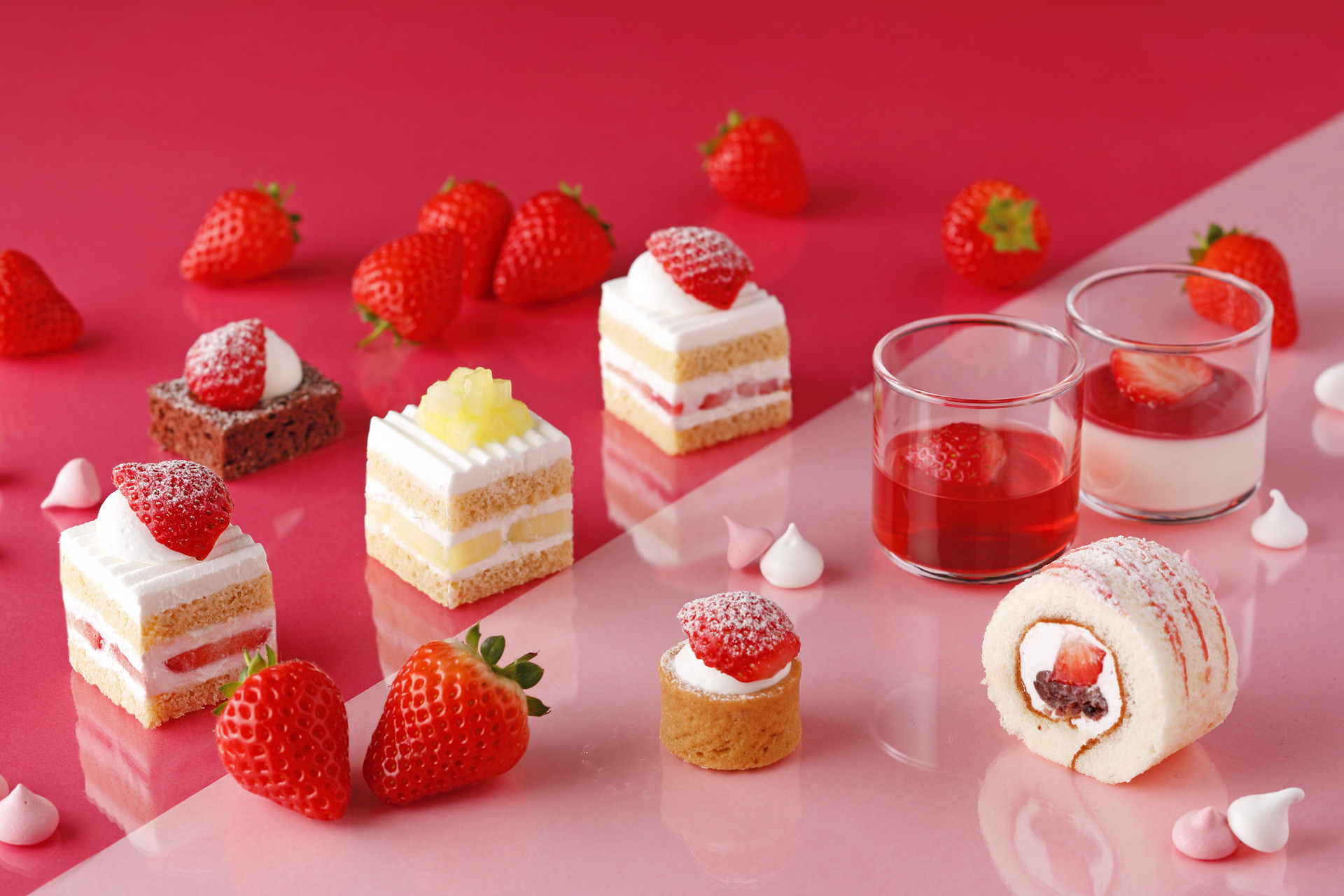 「新スーパーあまおうショートケーキ 」のほかにも、しっとりふんわり食感のロール生地であまおう・生クリーム・黒蜜あんこを包んだ和テイストの「あまおうロール」 や、サクサクのタルト生地にあまおうをトッピングした「あまおうタルト」、博多あまおうの果汁がぎゅっと詰まった「あまおうゼリー」に、マカロンなど見た目も可愛らしいスイーツが並びます。