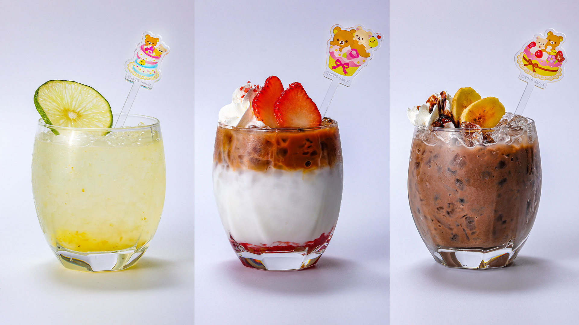 左からキイロイトリのゆずレモンスカッシュ、コリラックマのいちごミルクティー、リラックマのチョコバナナスムージー