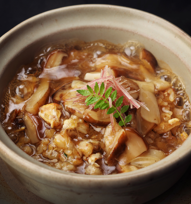 欅で大人気「特製ガーリックライス」と、香り豊かなポルチーニ茸を使った上湯(シャンタン)あんかけを組み合わせた一品。土鍋で仕上げるアツアツの〆ご飯です。