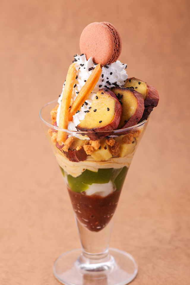 とろ~り甘い金蜜芋をたっぷり使った季節限定パフェ。焼き芋の香ばしさと、なめらかな金蜜芋クリームが絶妙なハーモニーを奏でます。ひとくちごとに秋の幸せが広がる至福のひとときをお愉しみください。
