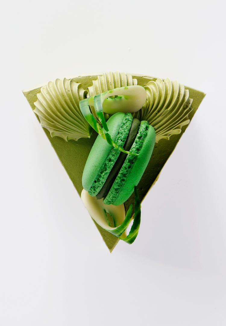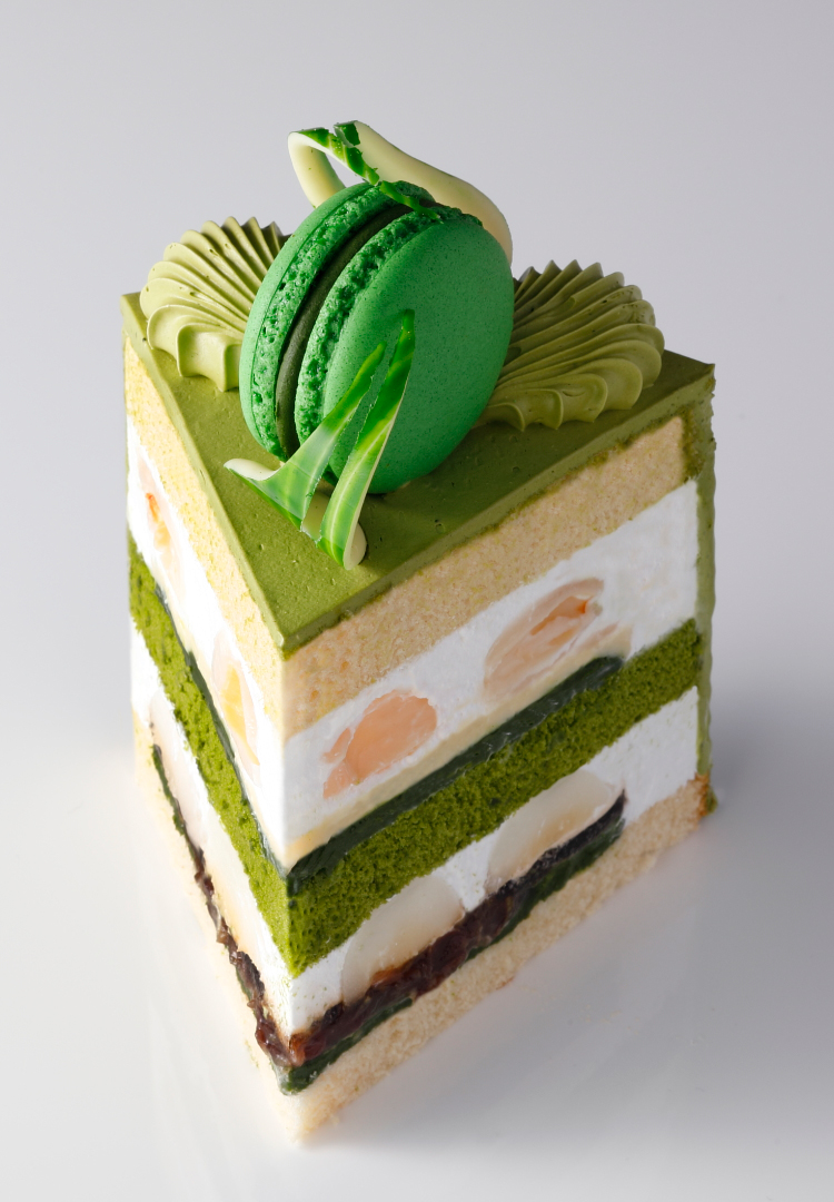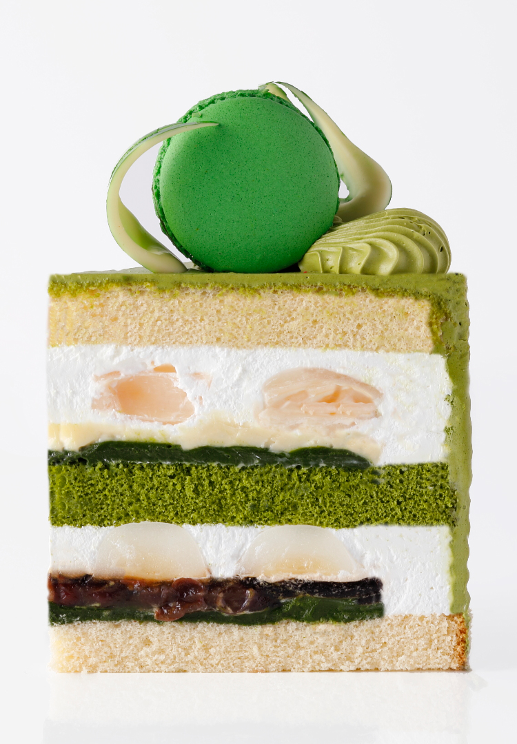 抹茶と和三盆糖を「玄米卵」に混ぜ合わせた2種類のふわふわなスポンジ生地で、青ヶ島産「ひんぎゃの塩」の利いた黒蜜あんこや黒蜜ゼリー、優しい甘みの豆乳ホワイトガナッシュ、濃厚な抹茶カスタードクリーム、そして歯ごたえのアクセントに白玉、みずみずしいライチを挟み、迫力のある美しい断面を作り出しています。口溶け滑らかな生クリームと、鮮やかな緑の抹茶クリームとの相性も抜群。奥深く香る抹茶マカロンとホワイトチョコレートのデコレーションで上品かつ大胆な仕上がりに。口いっぱいに和の風味が広がる極上ショートケーキです。