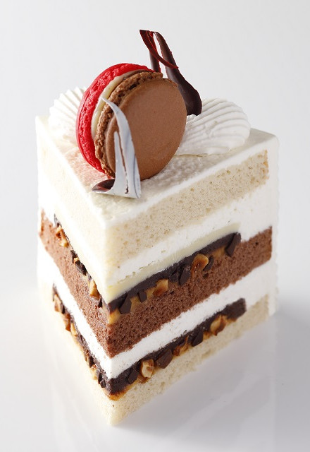 ケーキ全体を雪の様に覆うのは、アーモンドミルクと和三盆を使用した生クリーム。素材の味を邪魔しない、ほのかな甘みで包み込みます。トップに配したキャラメルガナッシュのマカロンがケーキを美味しく彩ります。