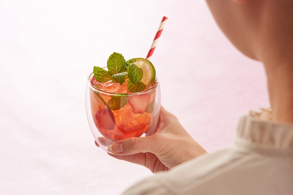 あまおうの魅力をぎゅっと詰め込んだ、いちご尽くしのモクテル(ノンアルコールカクテル)をご用意しました。濃縮された「博多あまおうシロップ」と、いちごの風味弾ける「あまおうサイダー」が織りなす爽快なハーモニーは格別。グラスの中がいちごで満たされた、甘酸っぱくも爽快なモクテルで乾杯を華やかに彩って。