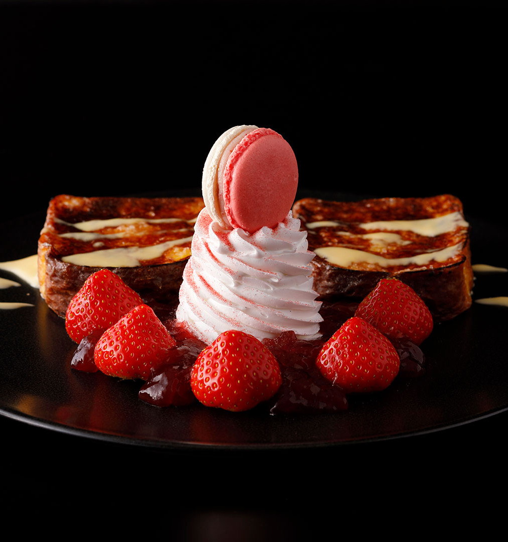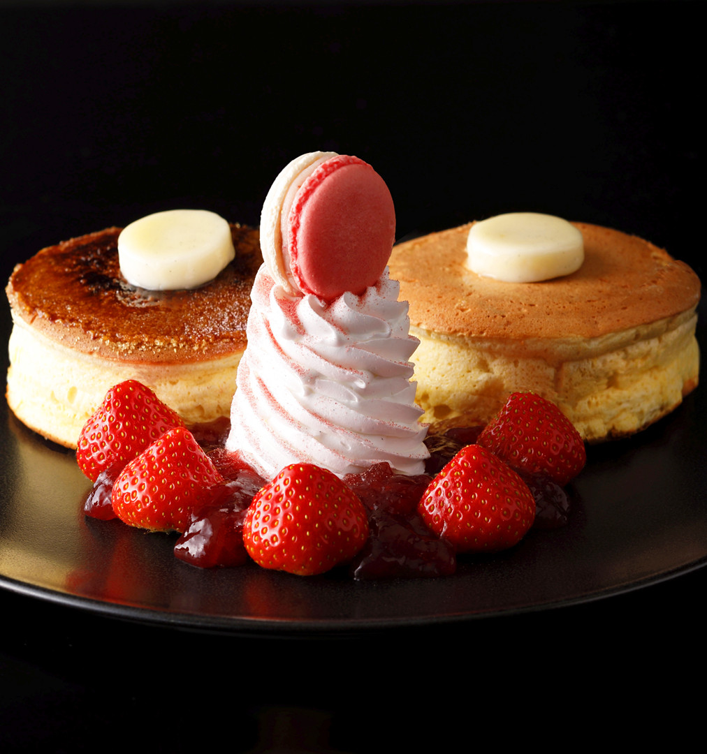 サイドには、冬から初春にかけて旬を迎える大粒の「博多あまおう」を贅沢に5粒添え、あまおうジュレ、抹茶カスタードクリーム、黒蜜あんこ、バニラビーンズ入りの特製生クリームの上に、あまおうマカロンをトッピング。3種類のメープルシロップをお好みであわせてお召し上がりください。