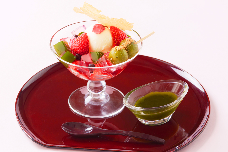 旬のあまおうと桜寒天に、春らしい串だんごを添えて。濃厚な抹茶くずソースを注げば、春の香りが花開きます。甘みと苦味が恋するように重なる、心ときめくひとときをお届します。