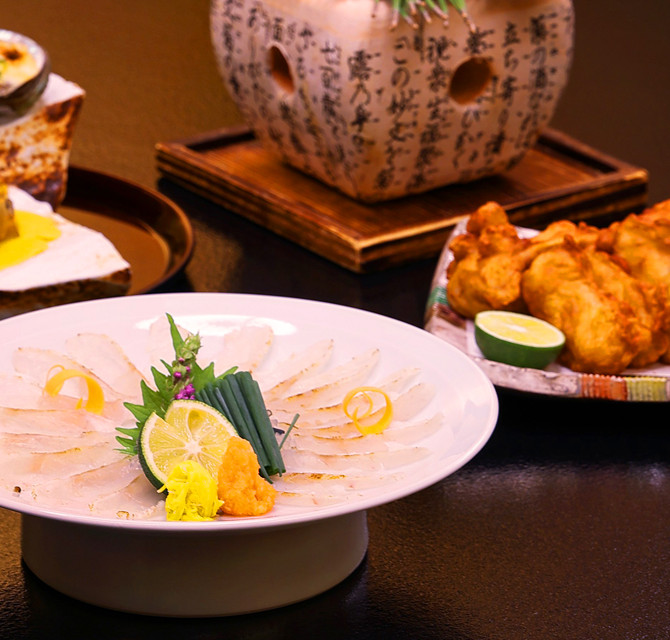 冬に旬を迎える高級食材「ふぐ」をふんだんに使用した、”ふぐ尽くし”の会席コースをお召し上がりいただけます。定番の薄造りは炙りで仕上げ、唐揚げ、鍋、雑炊に至るまでふぐ料理を存分にご堪能いただけます。
