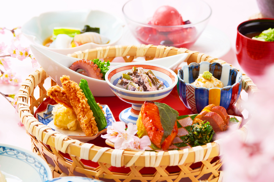 | 前菜 | 桜鱒の桜葉焼き 小袖玉子 蛸土佐煮と菜花辛子漬け 湯葉の鼈甲餡掛け 紅茶鴨レモン〆 山菜の梅和え 海老のおかき揚げ モッツァレラチーズ湯葉巻き 青菜の胡麻和え 青唐 |