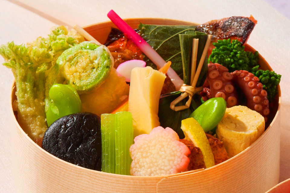 日本料理料理長 比留間健一が贈る、旬の味覚を詰め込んだ二段重。春の山菜や桜鱒など、季節の恵みを贅沢に。お花見やご自宅での集いに、心躍る「玉手箱」をお愉しみください。