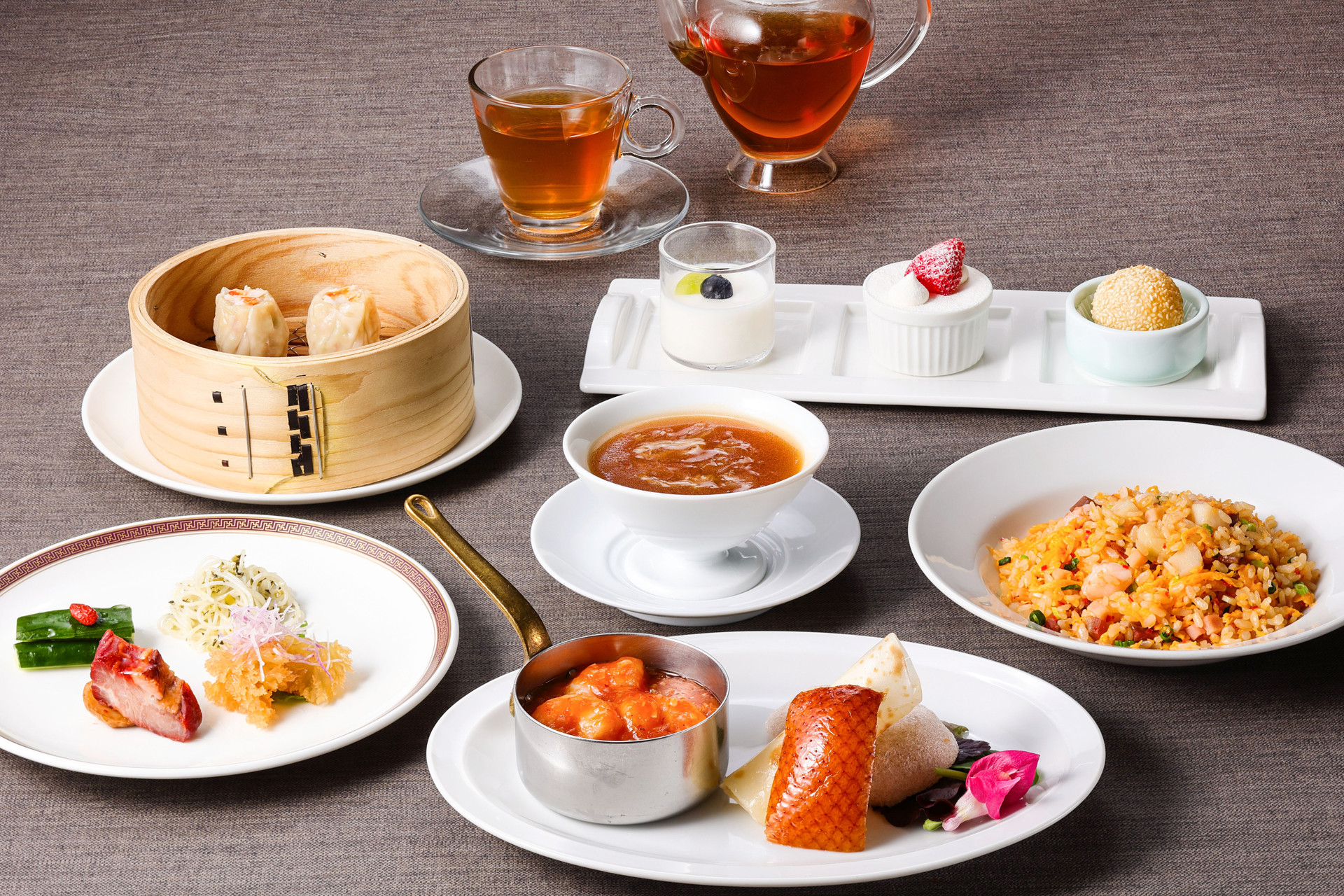大観苑の伝統料理であるふかひれスープと北京ダックなど通常料金では合計10,000円相当のメニューが揃った贅沢ランチ。王道のメイン料理と飲茶は週替わりでお楽しみいただけます。