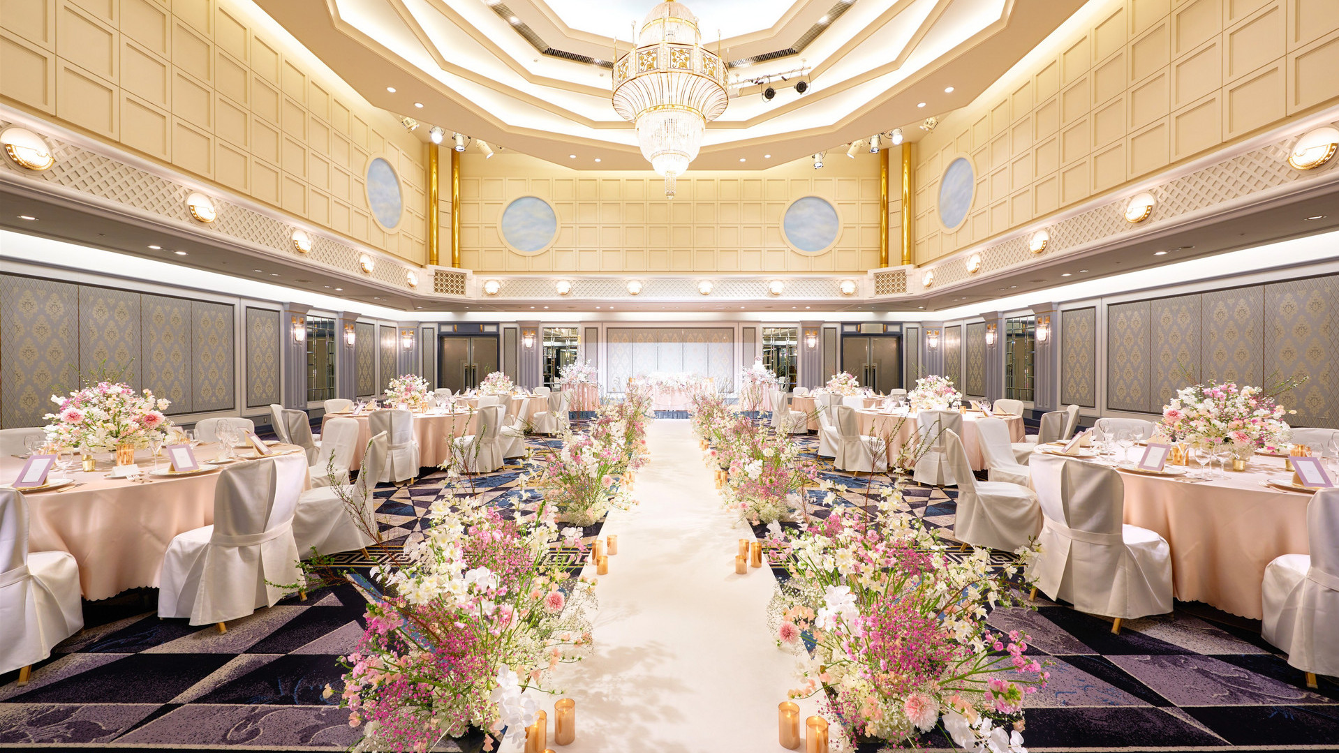 木の温もりが感じられる空間に天窓から注ぐ光とステンドグラスが映える「そよ風の教会」。 白大理石のバージンロードにキャンドルを並べれば、幻想的な雰囲気の中、おふたりとご両家を結ぶ神聖な挙式が始まります。