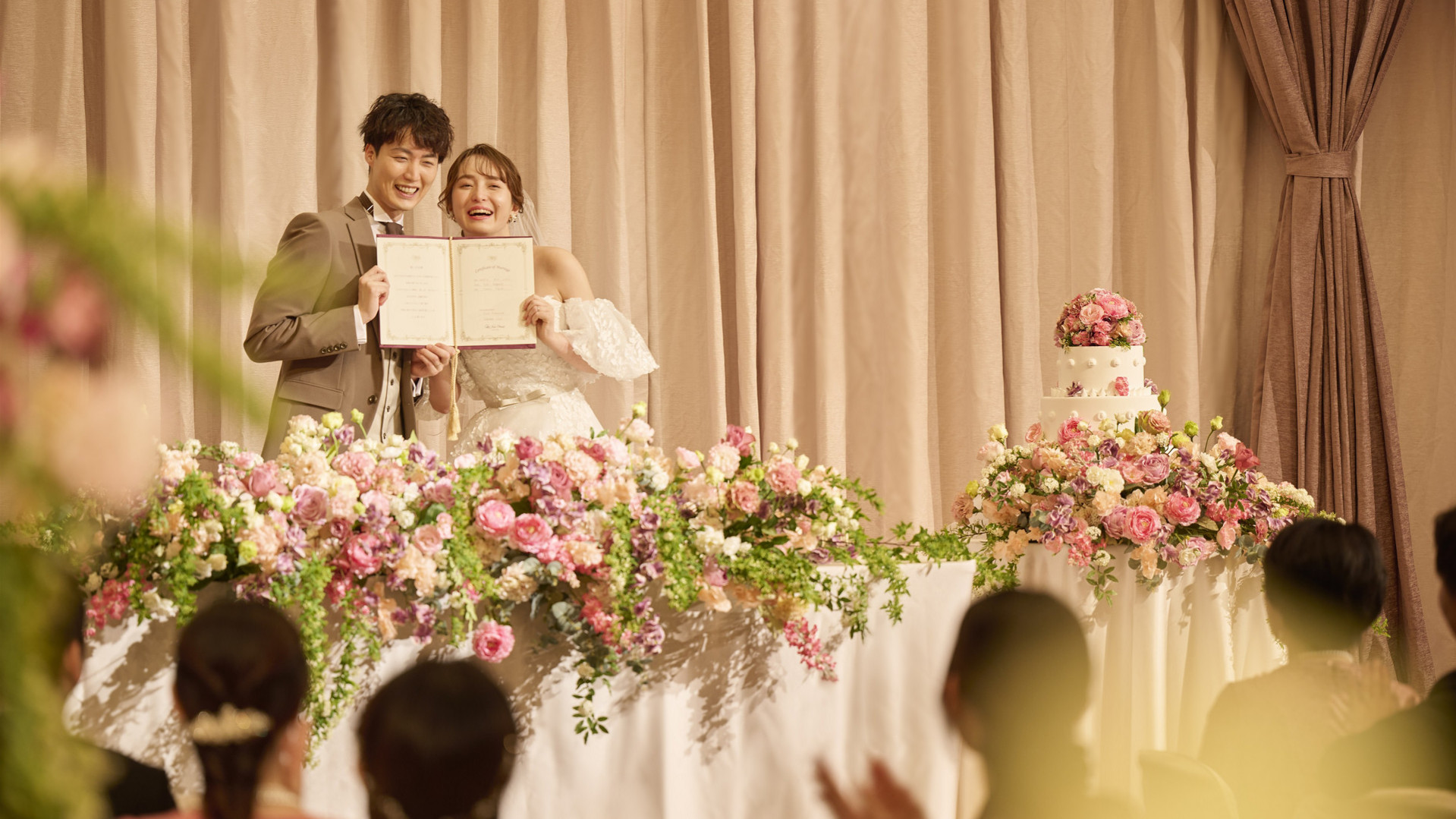 アットホームで堅苦しくない雰囲気のなか、大切なご家族やゲスト全員に見守られながらおふたりらしい誓いのカタチを叶えていただけます。披露宴会場で行うため、移動もなくゲストも安心。おふたりこだわりの挙式がお得に叶うのも人気のポイントです。