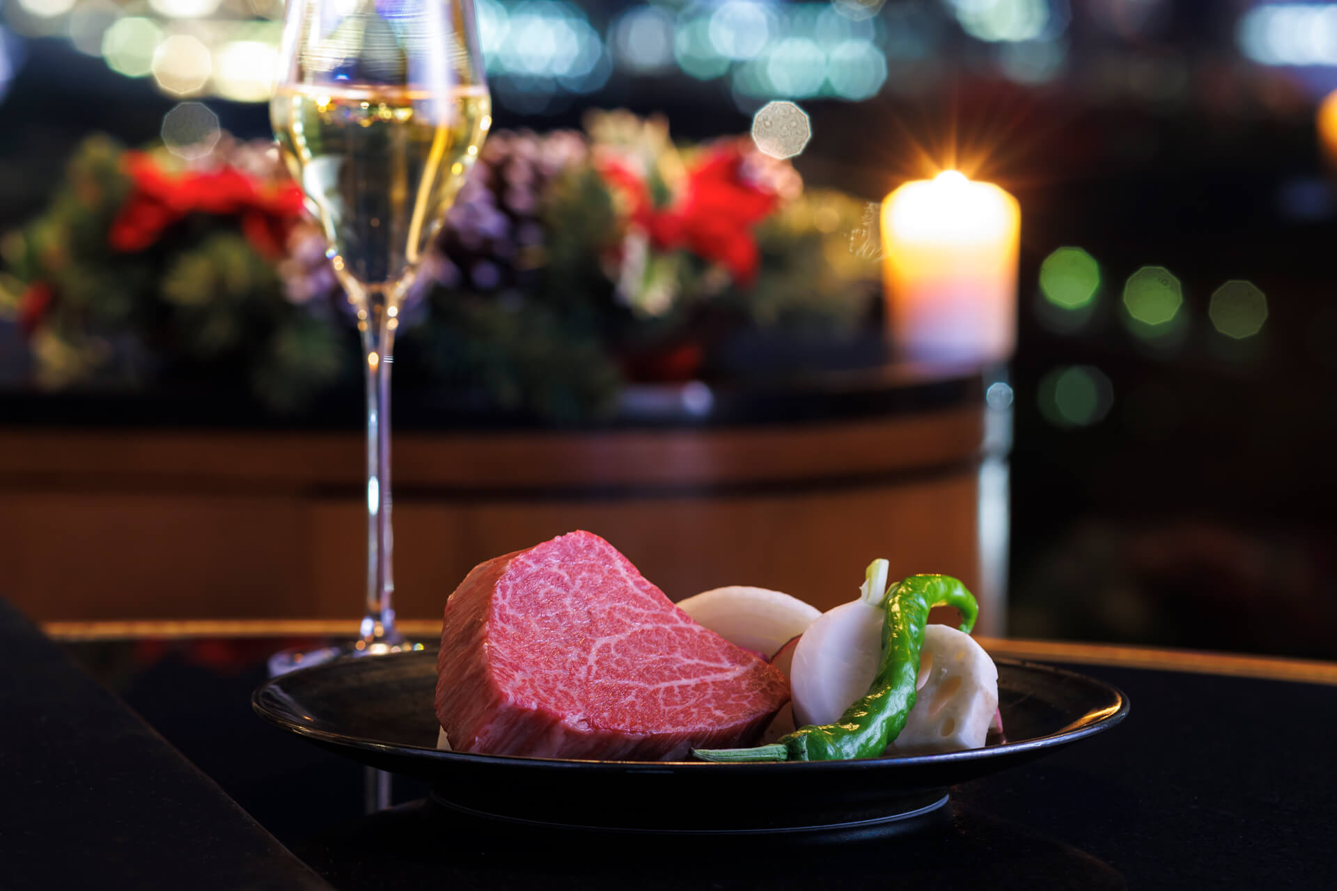 全国各地から良質な和牛を取り揃える、鉄板焼「けやき」では、フォアグラや活蝦夷鮑、活伊勢海老はもちろん佐賀牛などクリスマスディナーならではの豪華食材が登場。目の前で焼き上げるシェフの手さばきや、最上階の煌めく夜景とともに聖夜のひとときをお過ごしください。