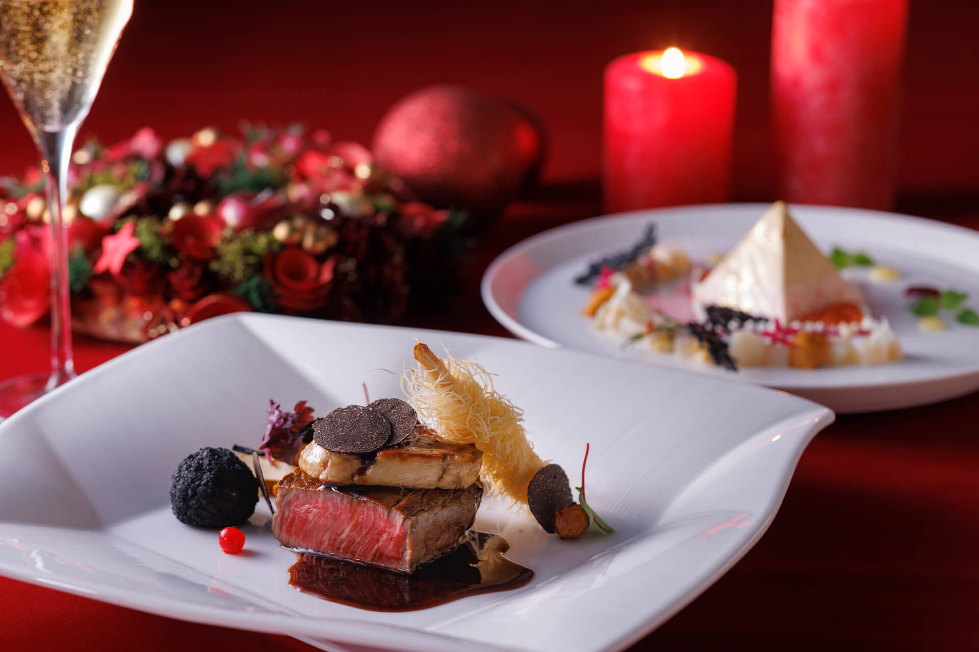 キャビアやフォアグラ、黒毛和牛など特撰食材を味わえるディナーコース。デザートにはパティシエ特製のクリスマスデザートをご用意。