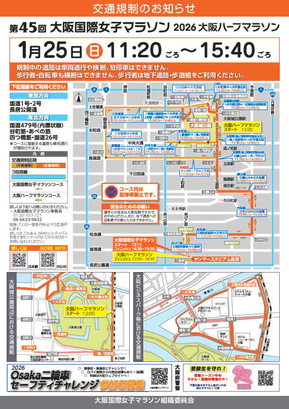 大阪国際女子マラソン開催に伴い、大阪市内では交通規制が行われます。