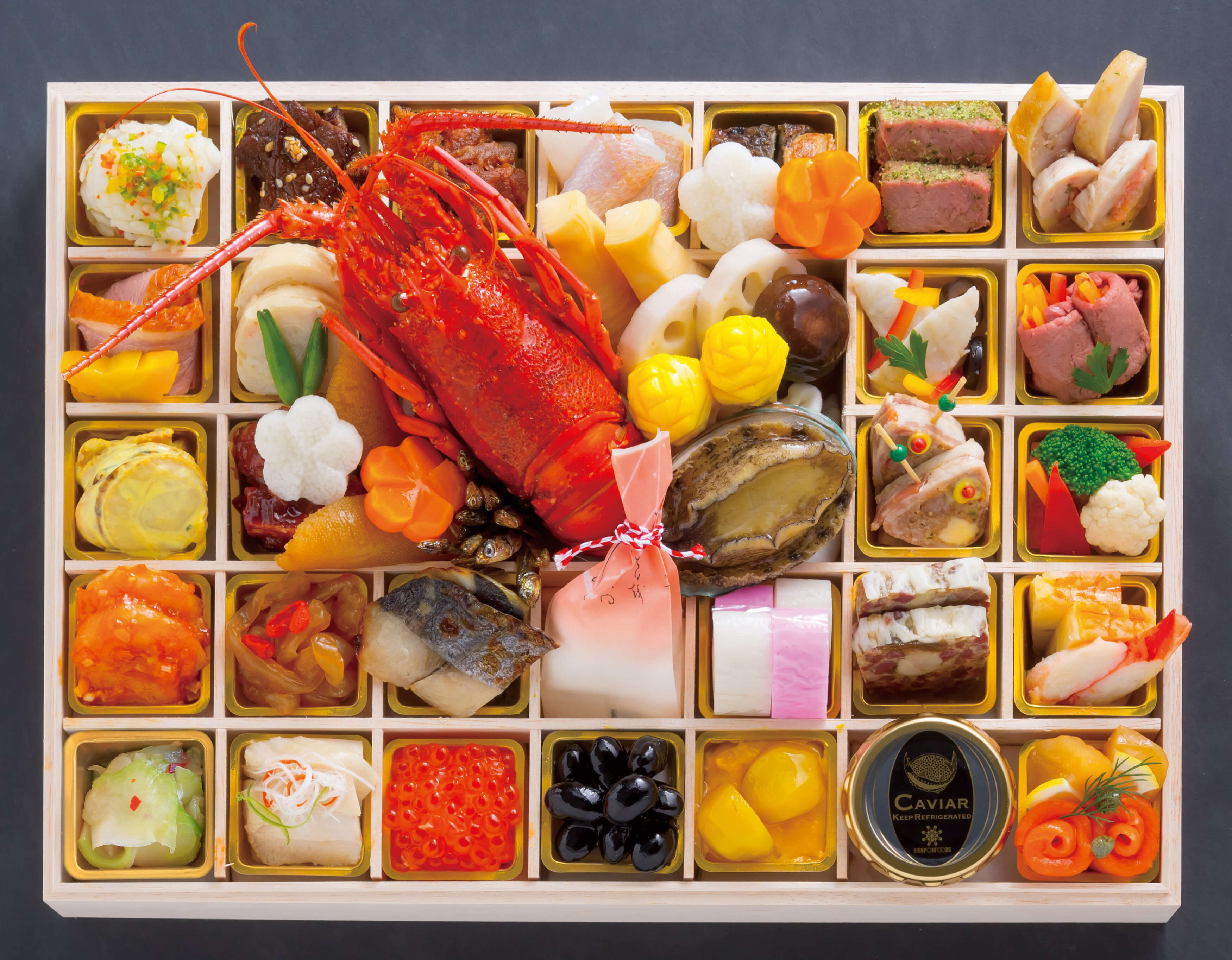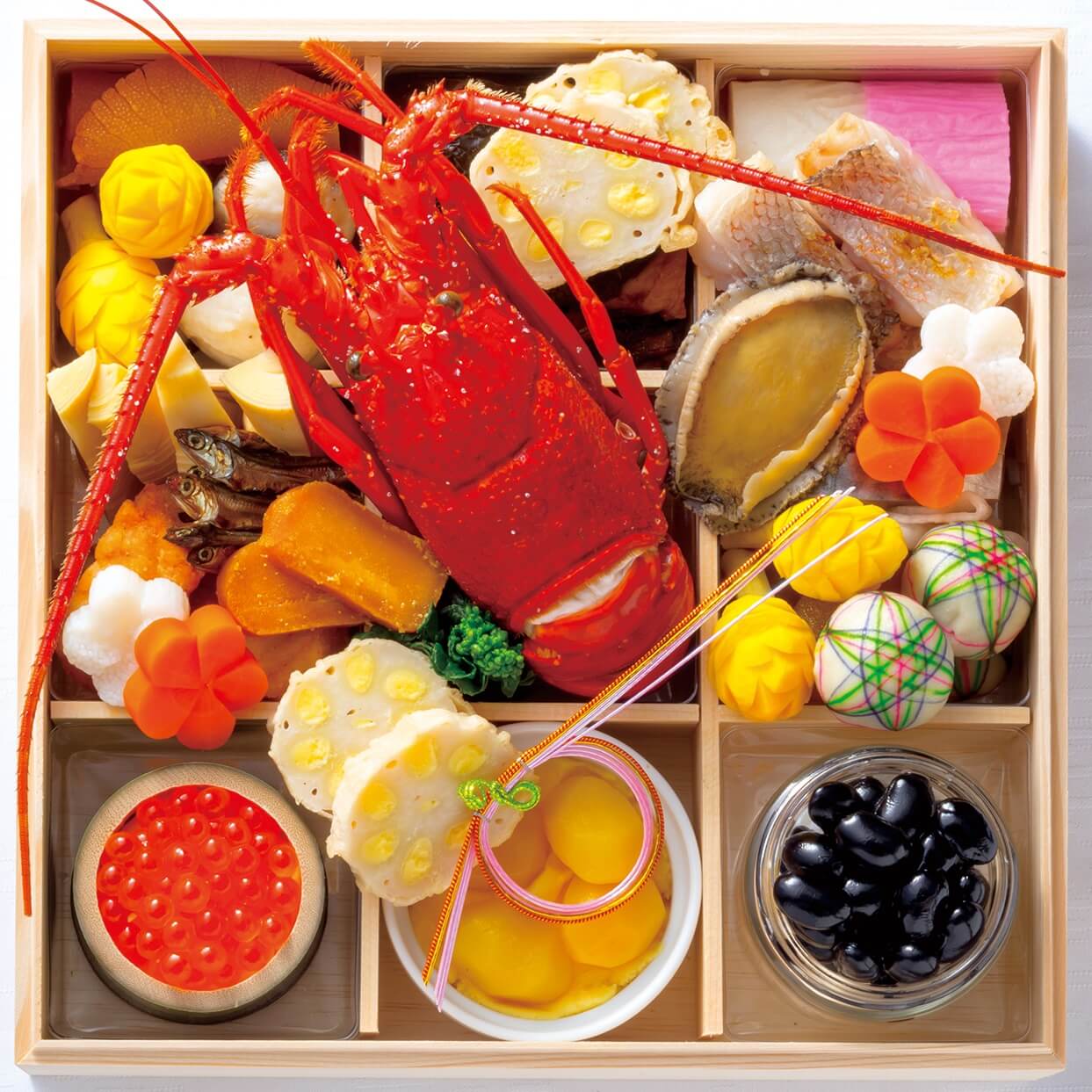 伊勢海老/あわび旨煮/数の子醬油漬け/栗きんとん/くわい含め煮/黒豆煮/さごし西京漬け/竹の子煮/梅人参/梅長芋/うなぎ八播巻き/千枚漬け/田作り/紅白蒲鉾/綱笠柚子/いくら醤油漬け/裏白椎茸/蓮根白煮/鱈旨煮/肉味噌/小鯛笹漬け