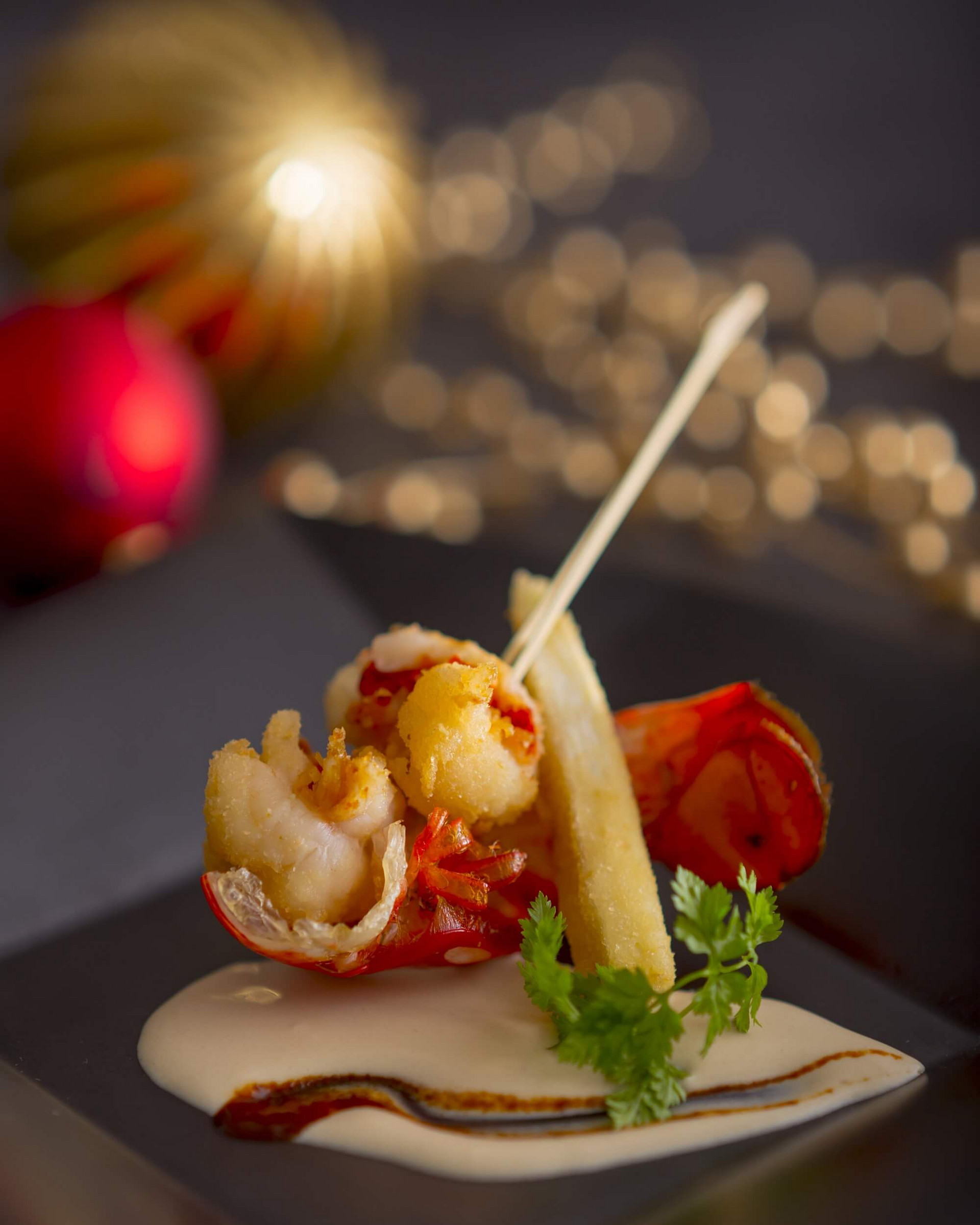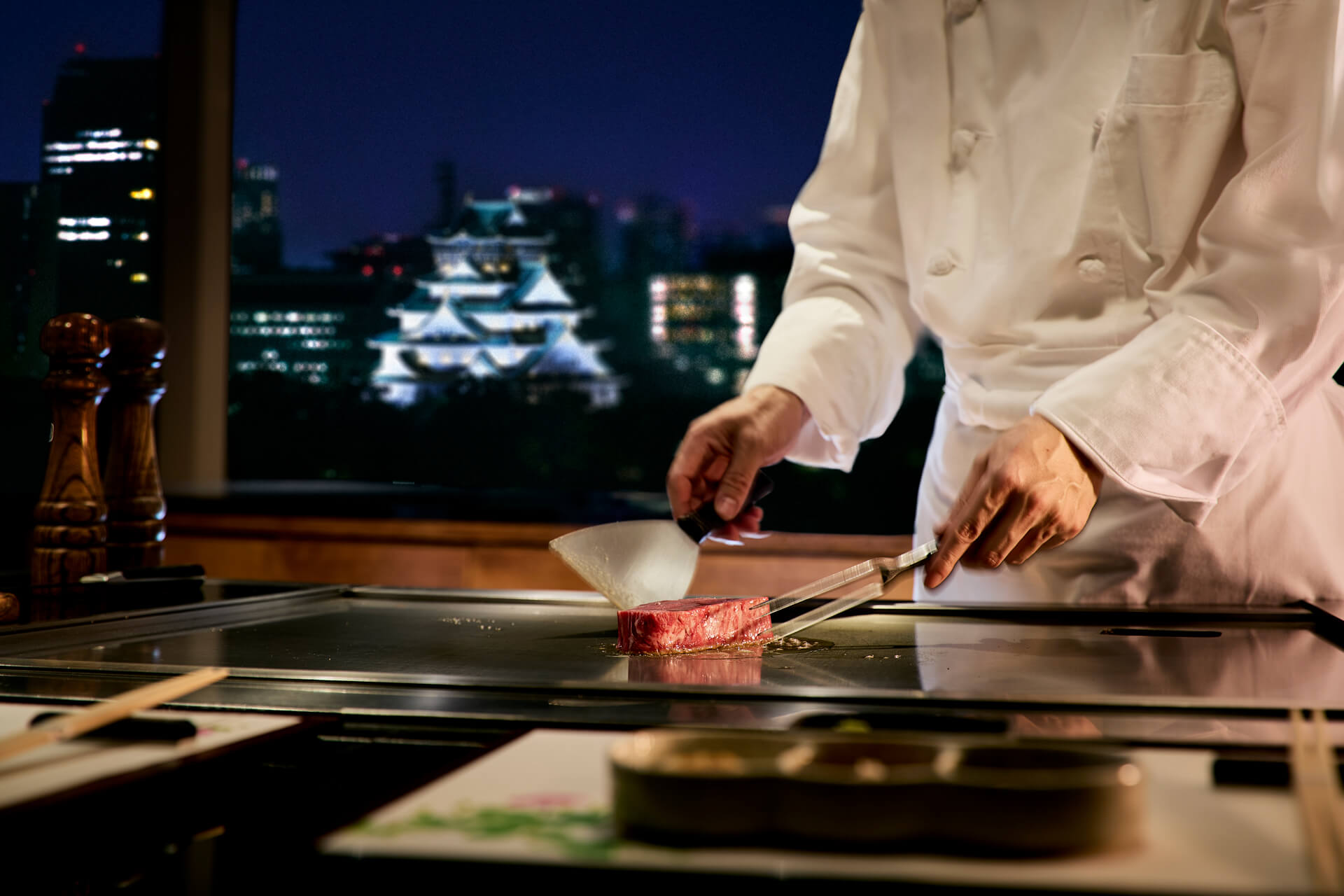 ホテル最上階に位置する鉄板焼「けやき」へ足を踏み入れると目の前に広がるカウンターの熱気とともに、ライトアップされた大阪城を囲むように大阪市内の高層ビル群が放つまばゆい光の海が広がります。そんな「けやき」からは、活蝦夷鮑の濃厚な旨味を鉄板焼で引き出し、柚子胡椒餡かけの爽やかな香りが重なる「活蝦夷鮑の鉄板焼き 柚子胡椒餡かけ」や、希少な佐賀牛A5フィレを絶妙な火入れで仕上げ、柔らかさと濃厚な旨味を最大限に引き出した「佐賀牛A-5 フィレ(110g)」などをご用意しました。最上階の煌めく夜景とともに聖夜のひとときをお過ごしください。