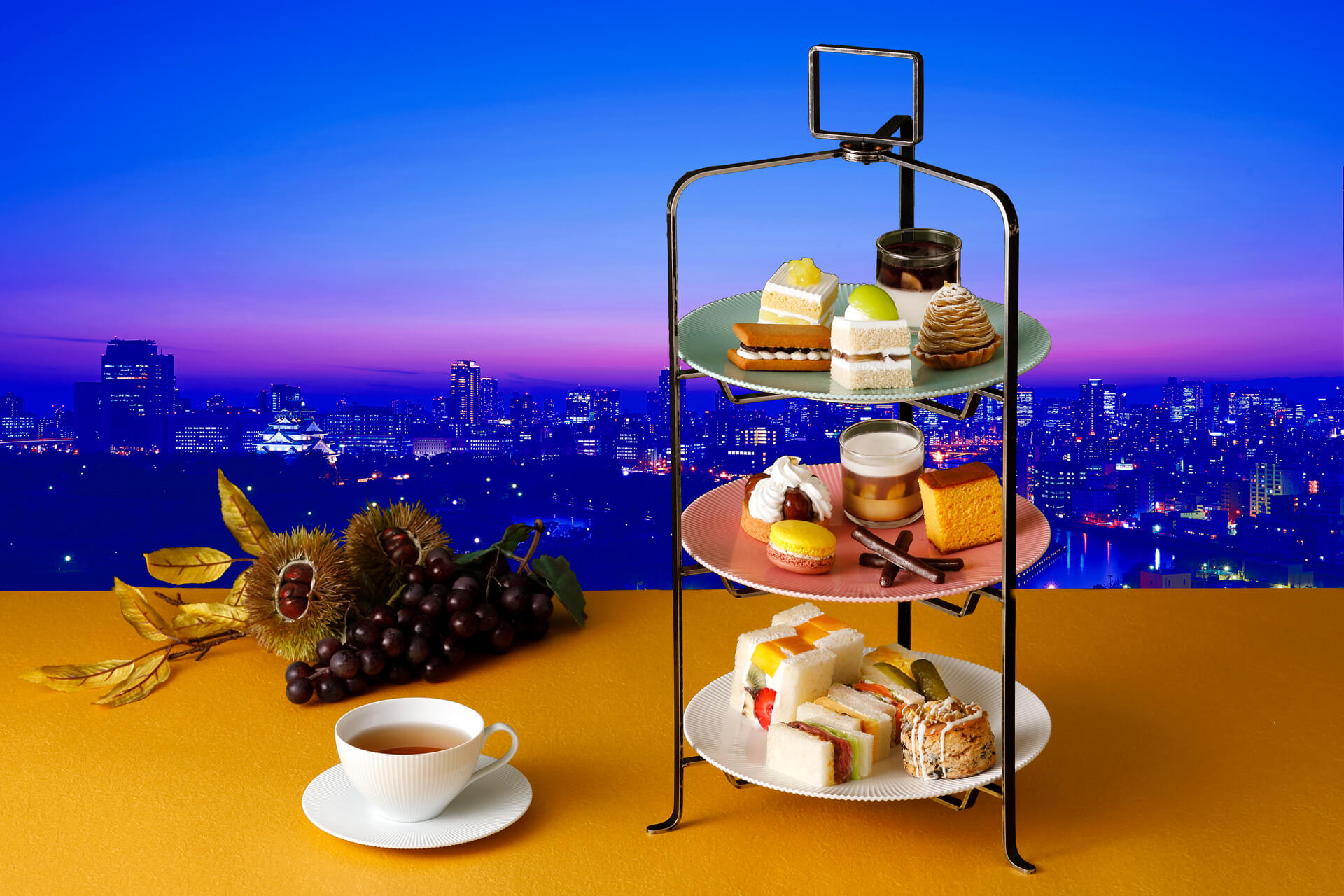 スカイラウンジから見える大阪城と都心の夜景と一緒に、アフタヌーンティースタンドで登場するミニサイズの「スーパーモンブラン」や「グレープショートケーキ」など、秋の味覚をスパークリングワインをはじめとする多彩なドリンクとともに、華やかにそろったラインナップをお愉しみいただくことが出来ます。