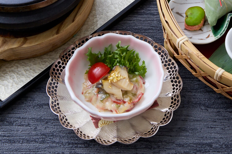秀吉が初めて一国一城の主となった地。琵琶湖の真水と海の幸が交わる場所であり、若々しい活力を「とび子」の食感で、瑞々しさを「ぬた和え」で表現しました。