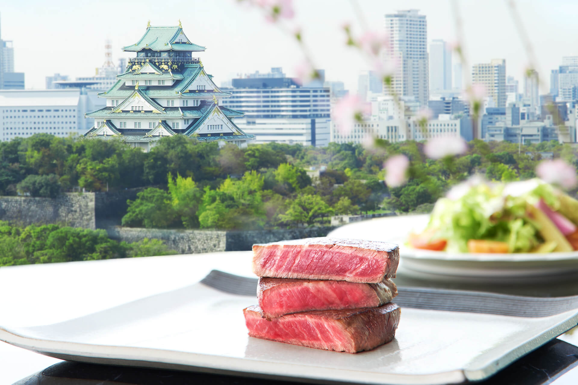 梅が咲き誇る大阪城公園を背景に、400年以上歴史のある大阪城を眺めながら美食を堪能していただける、鉄板焼「けやき」。梅の見頃である2月~3月上旬にかけて、期間限定の観梅ランチをご用意しました。前面に広がる梅を見ながら特別なランチをお愉しみください。