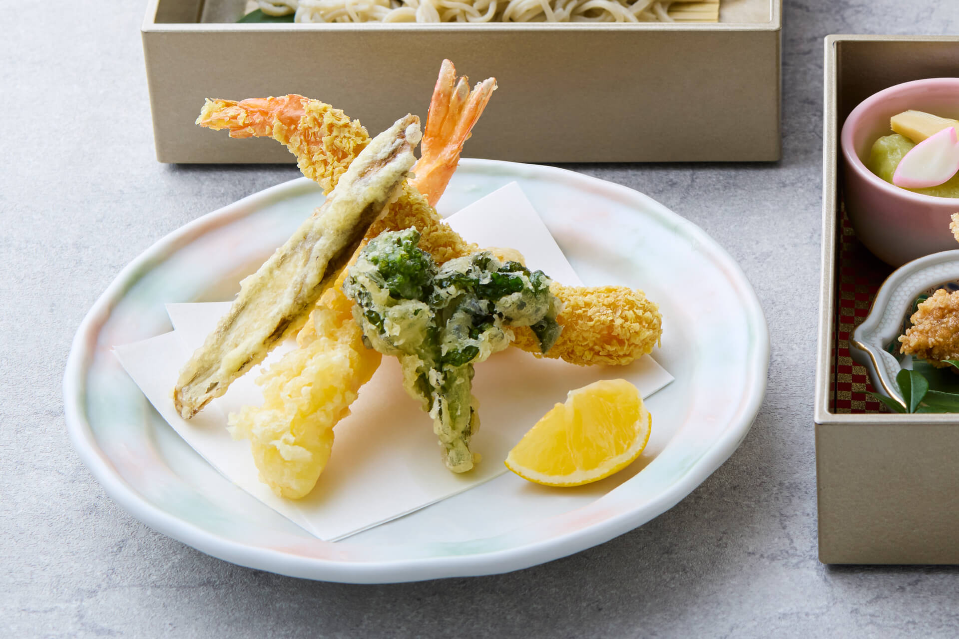 そこに海老の天麩羅という彩りが加わることで、秀吉の飛躍を後押しする兄弟の勢いを表現しています。そばがきは一度揚げて外を固め、中はふんわりと。