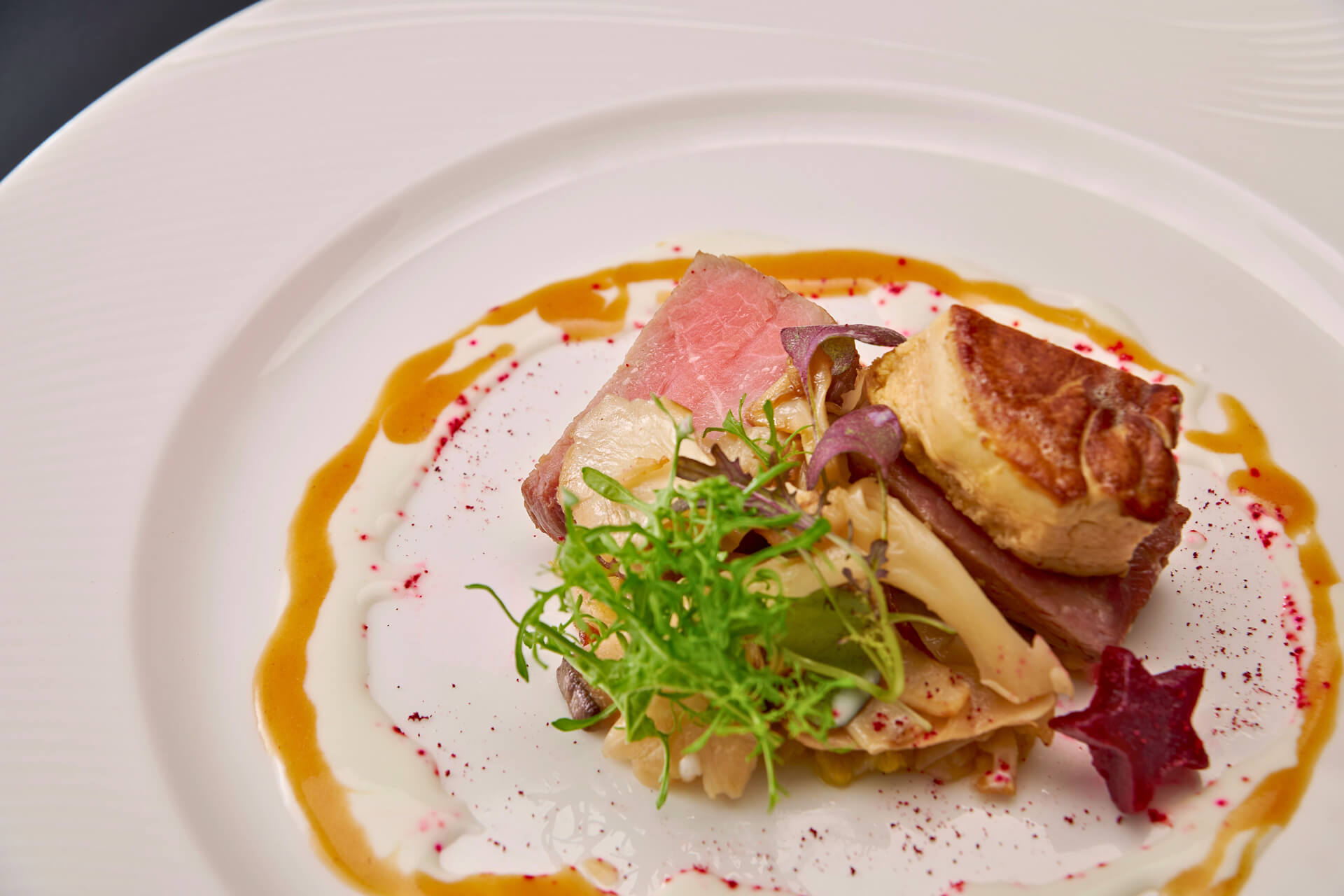 柔らかく繊細な仔牛ロースを香ばしく焼き上げ、濃厚なフォアグラのコクを添えた、華やかで贅沢な一皿。