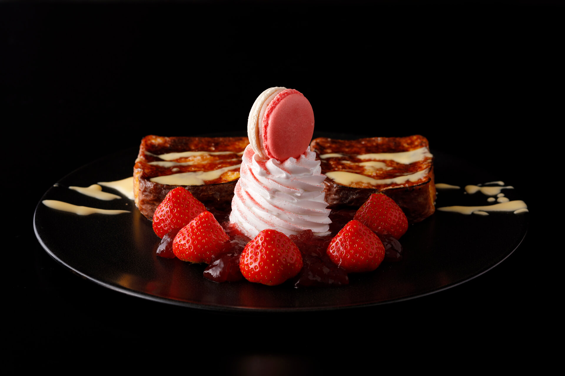 サイドには、冬から初春にかけて旬を迎える大粒の「博多あまおう」を贅沢に5粒添え、あまおうジュレ、抹茶カスタードクリーム、黒蜜あんこ、バニラビーンズ入りの特製生クリームの上に、あまおうマカロンをトッピング。3種類のメープルシロップをお好みであわせてお召し上がりください。
