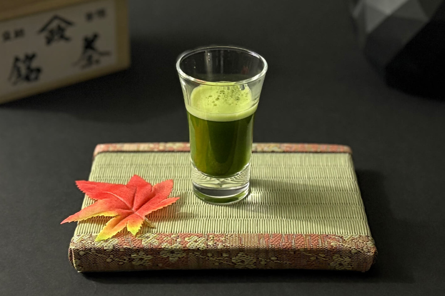 今回デザートで使用している石臼引きの一番茶"山政小山園「さみどり」"をショットグラスでご用意。